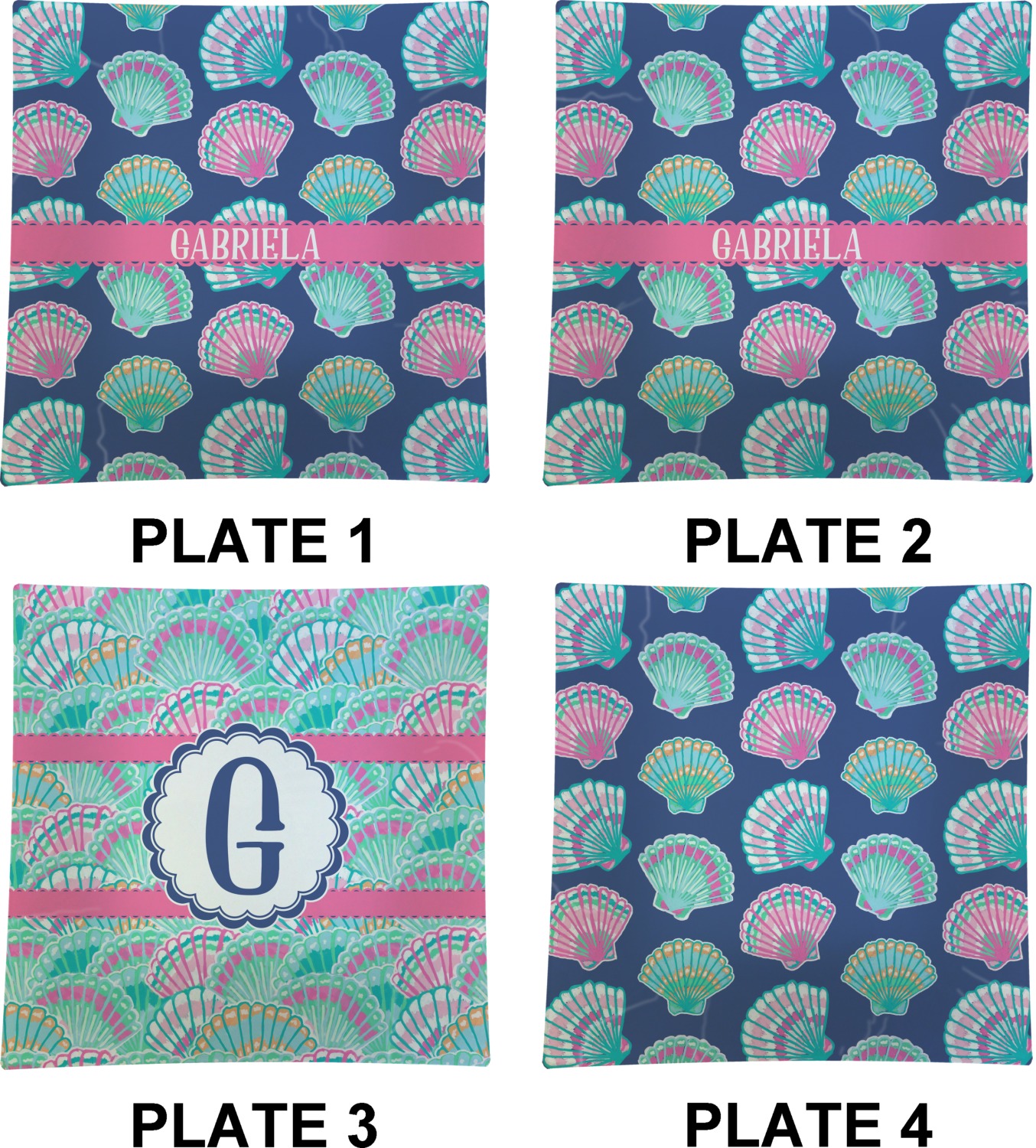 In this design, light pink and teal shells are randomly arranged on a blue background to create a stunning pattern. The main design uses a scalloped ribbon with a name for personalization. The coordinating pattern is filled with overlapping teal and pink shells.
