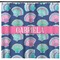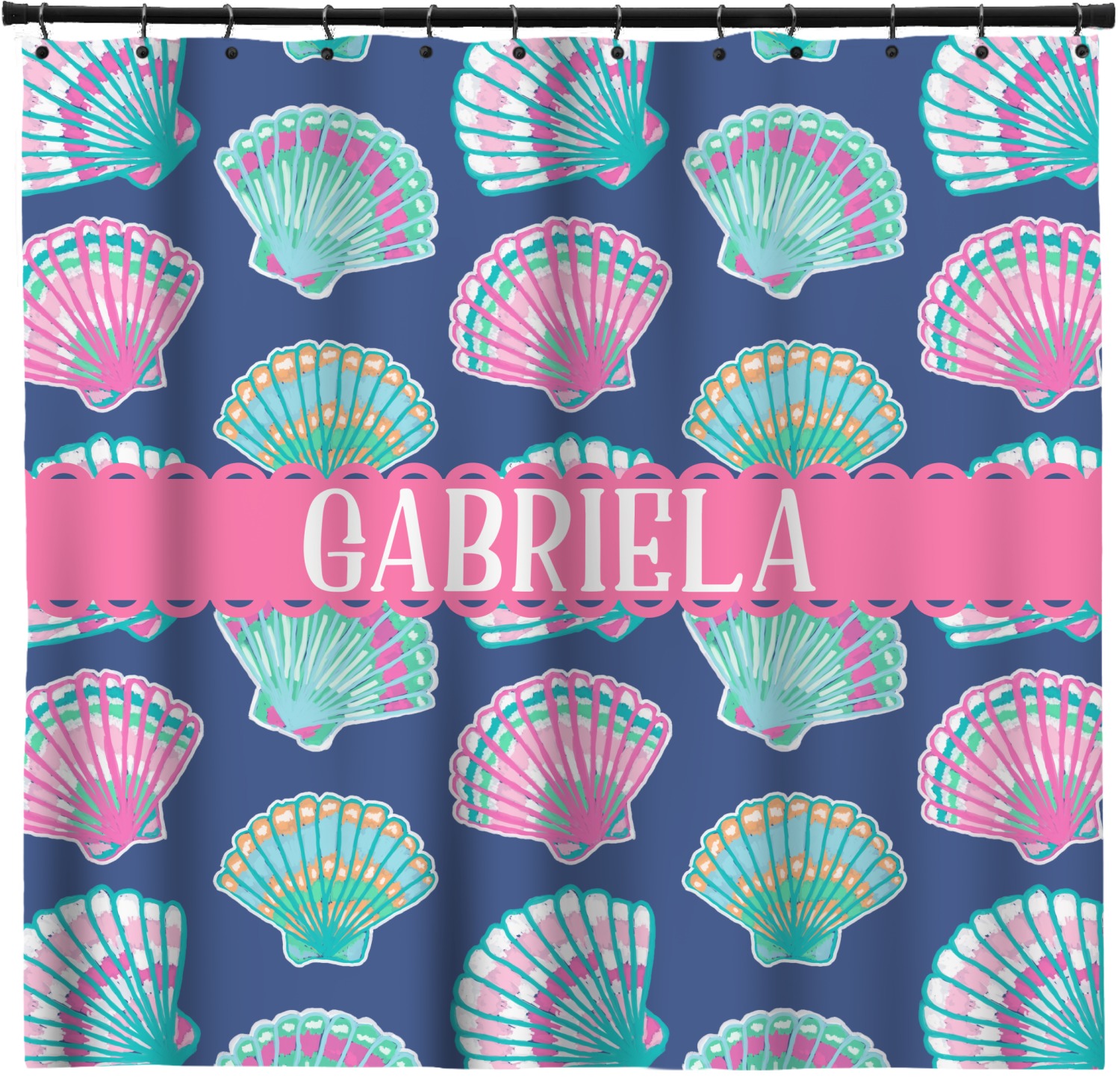 In this design, light pink and teal shells are randomly arranged on a blue background to create a stunning pattern. The main design uses a scalloped ribbon with a name for personalization. The coordinating pattern is filled with overlapping teal and pink shells.