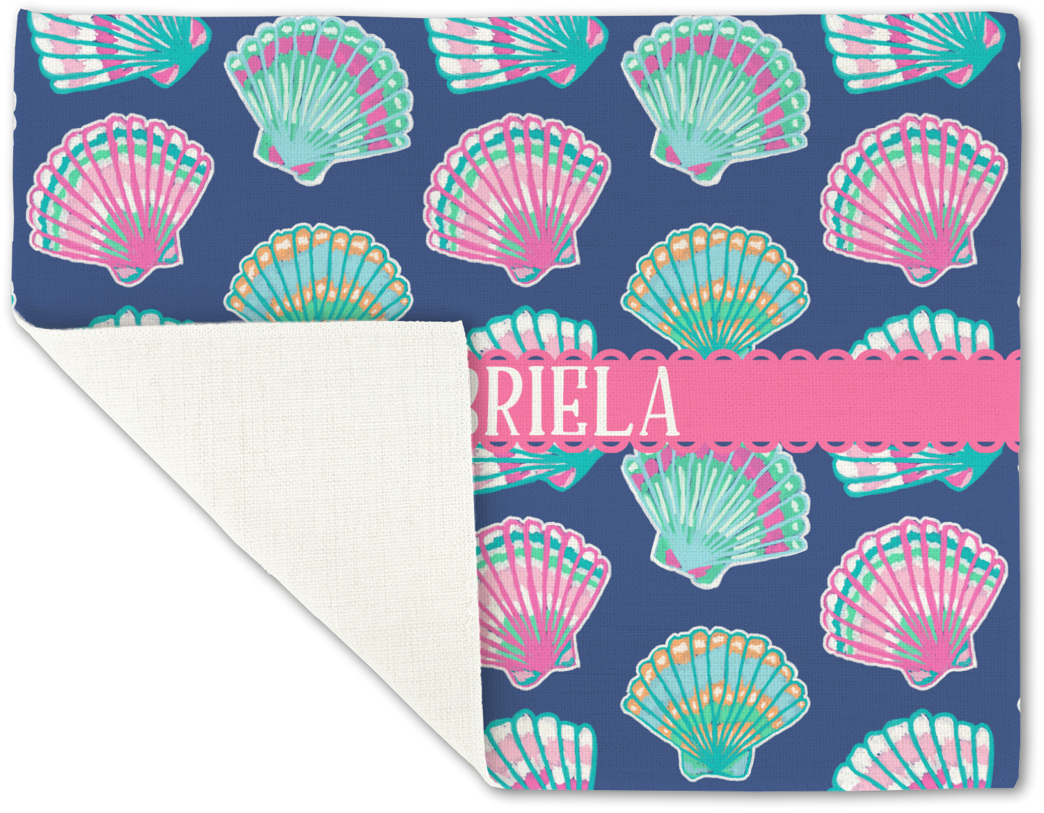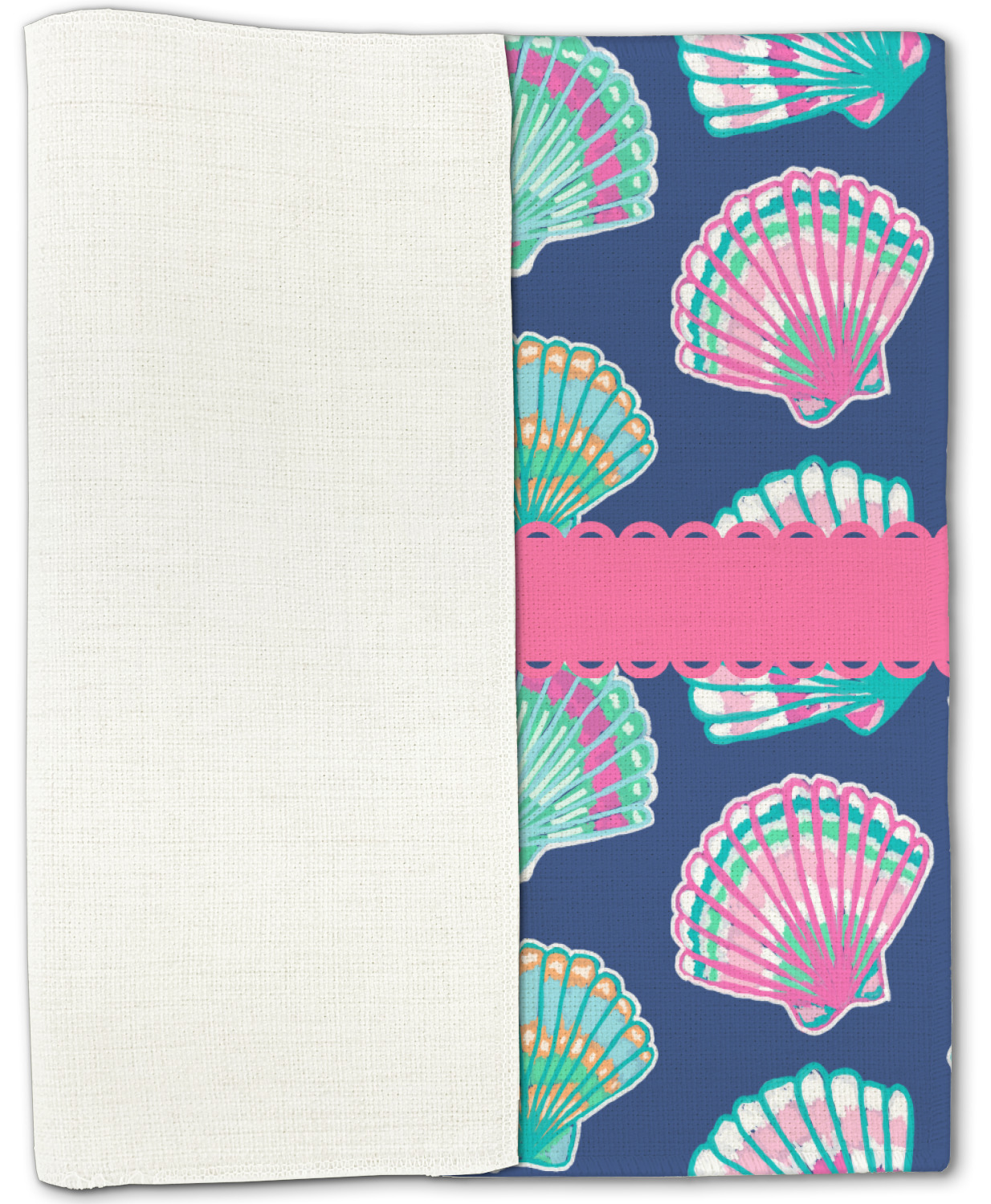 In this design, light pink and teal shells are randomly arranged on a blue background to create a stunning pattern. The main design uses a scalloped ribbon with a name for personalization. The coordinating pattern is filled with overlapping teal and pink shells.
