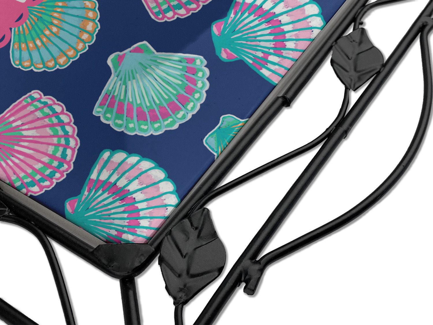 In this design, light pink and teal shells are randomly arranged on a blue background to create a stunning pattern. The main design uses a scalloped ribbon with a name for personalization. The coordinating pattern is filled with overlapping teal and pink shells.