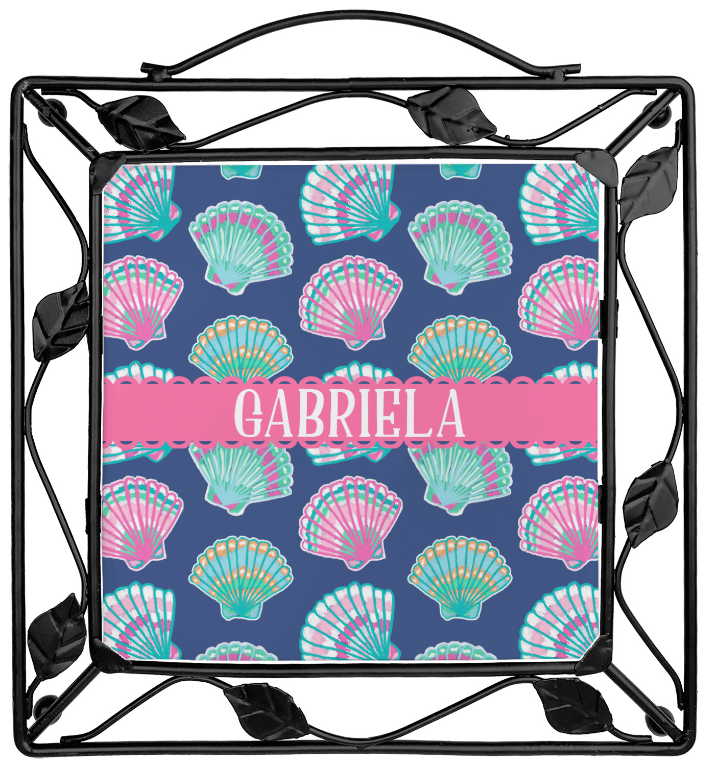 Our square trivets are made from a durable, wrought iron. This model features 4 small half circles, one on each corner, and a larger ring of iron that circles the central, customized tile. Each of the 4 corners has a round foot on its bottom for stability. This trivet is 8.75 by 8.75 inches, but the central tile measures at 6 inches on both sides.