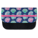 In this design, light pink and teal shells are randomly arranged on a blue background to create a stunning pattern. The main design uses a scalloped ribbon with a name for personalization. The coordinating pattern is filled with overlapping teal and pink shells.