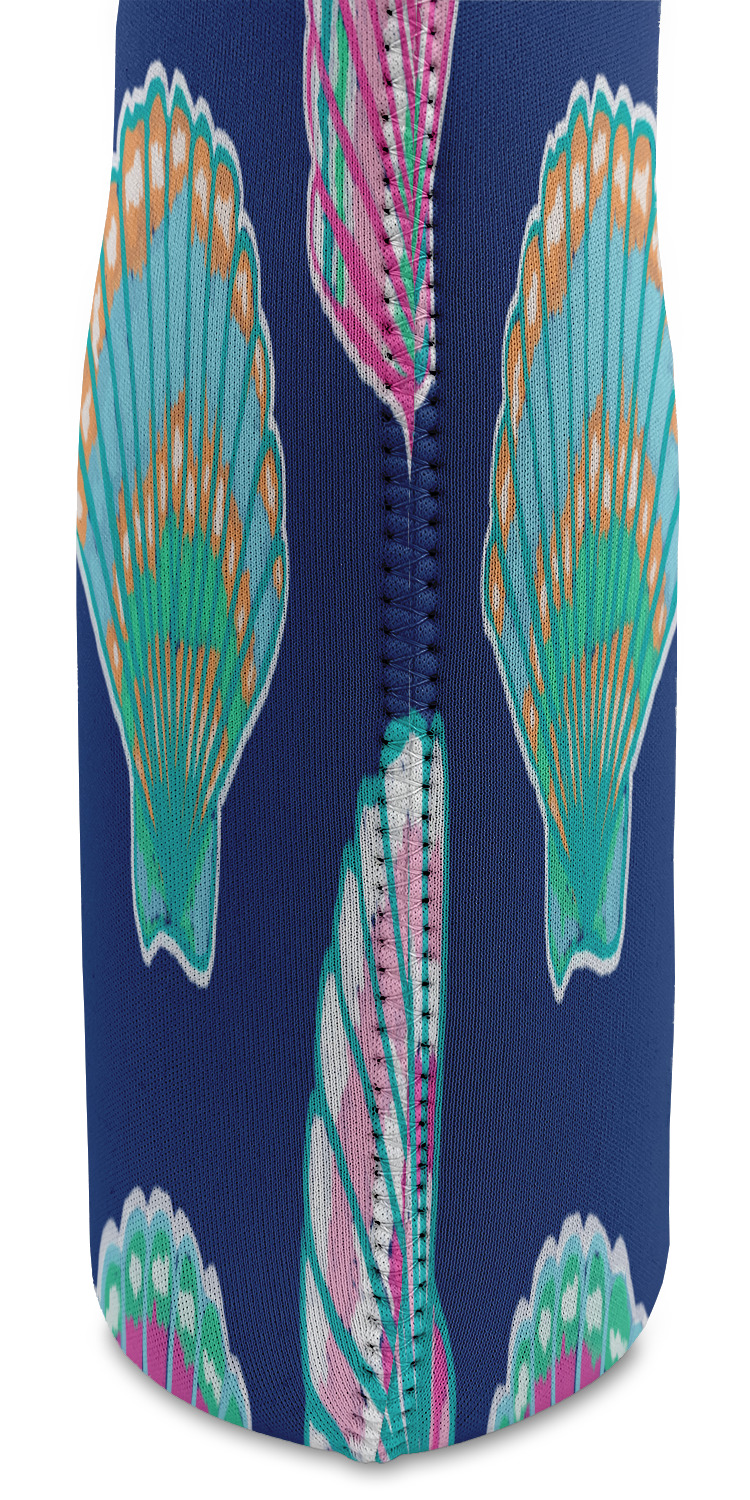 In this design, light pink and teal shells are randomly arranged on a blue background to create a stunning pattern. The main design uses a scalloped ribbon with a name for personalization. The coordinating pattern is filled with overlapping teal and pink shells.