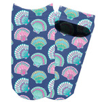 In this design, light pink and teal shells are randomly arranged on a blue background to create a stunning pattern. The main design uses a scalloped ribbon with a name for personalization. The coordinating pattern is filled with overlapping teal and pink shells.