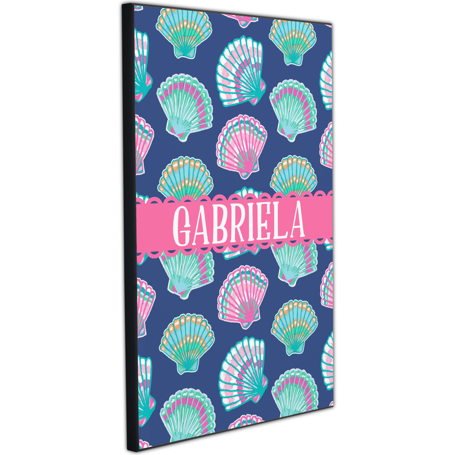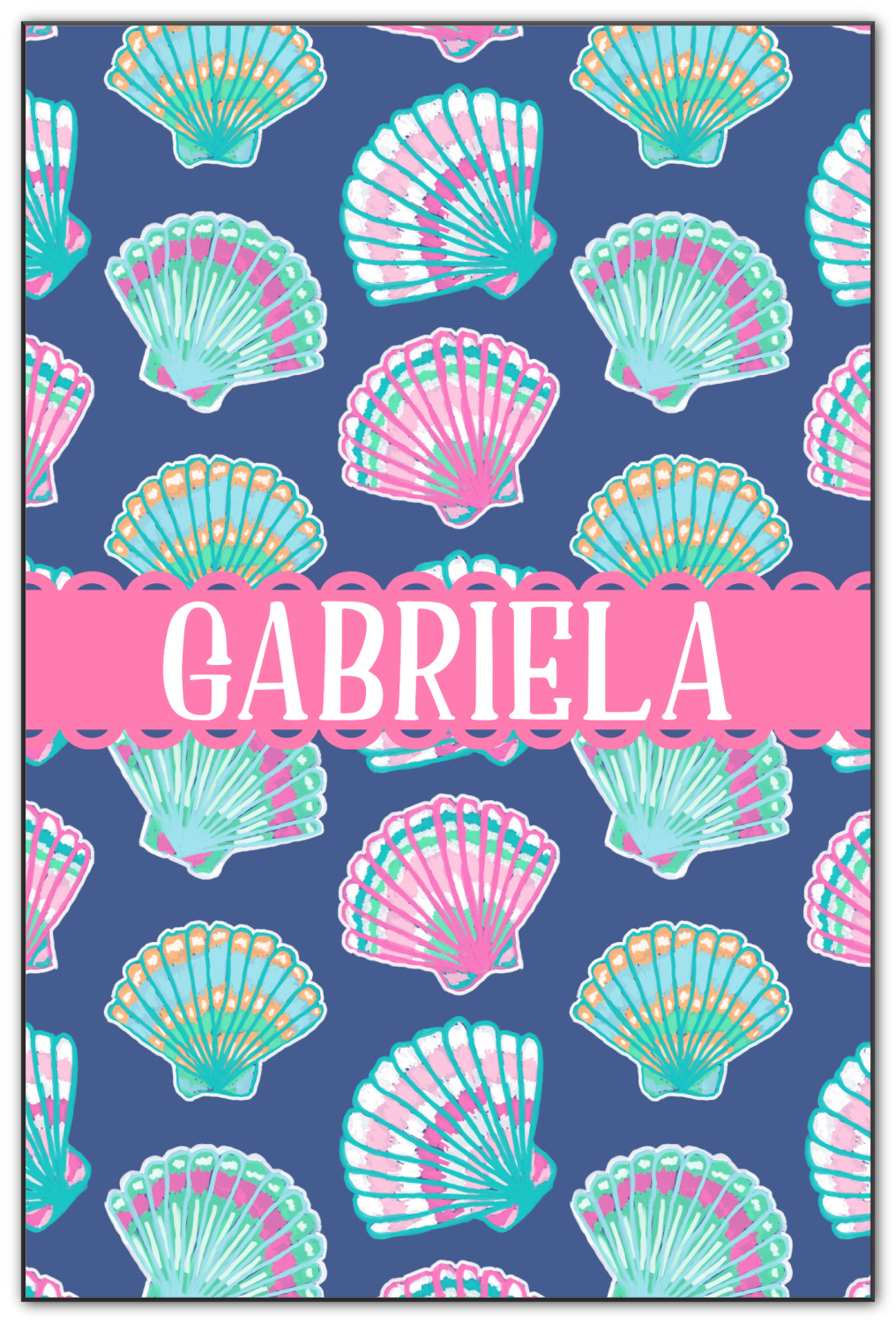 In this design, light pink and teal shells are randomly arranged on a blue background to create a stunning pattern. The main design uses a scalloped ribbon with a name for personalization. The coordinating pattern is filled with overlapping teal and pink shells.