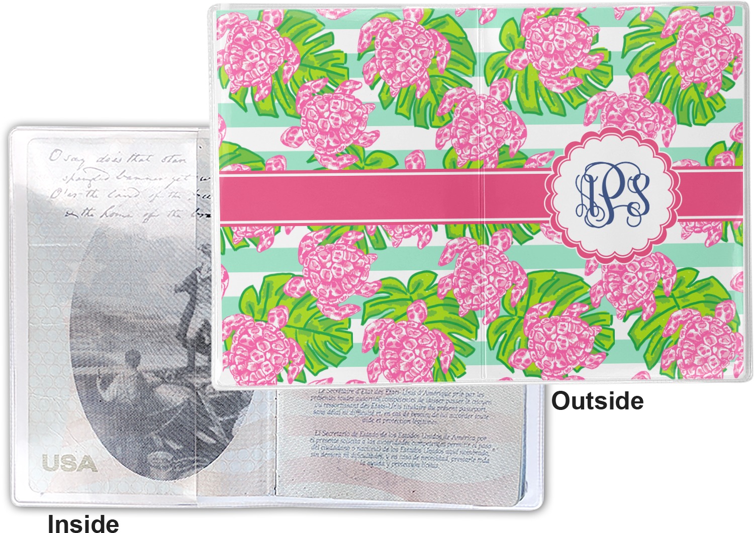 This cover is made of a sturdy clear vinyl with a personalized vinyl insert inside. There is a large and a small pocket on either side to hold the covers of your passport easily and firmly. The passport holder is approximately 7.5" x 5.25", the perfect size to snugly fit your passport. This slim cover is the perfect way to protect your passport without being one more bulky item you have to carry.
