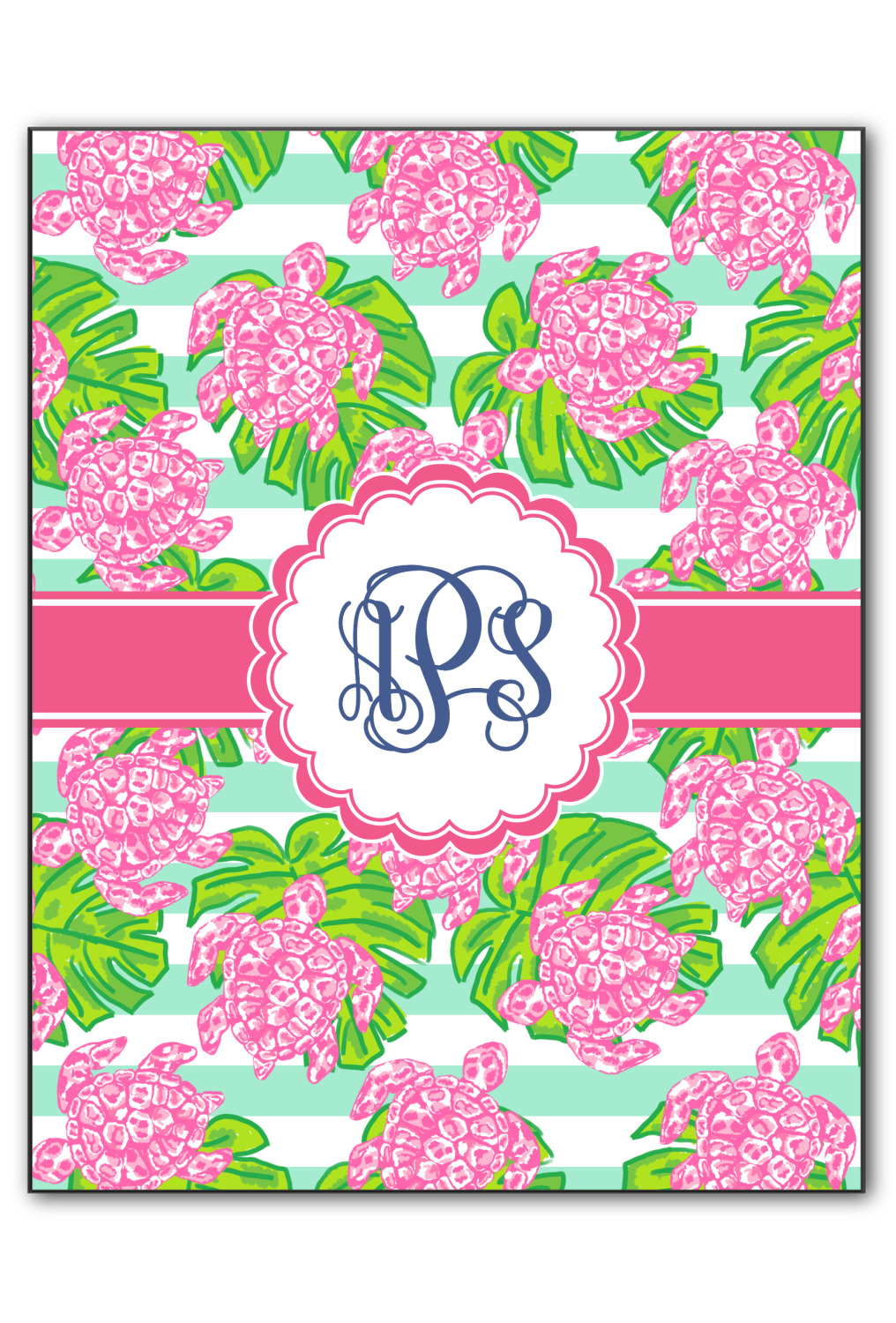 Looking for something Preppy? This design has gorgeous flashy pinks and greens and, of course, monograms! The main design is layered with mint & white stripes, beautiful green leaves and some adorable pink turtles. This will be the perfect design for a typical college girl!
