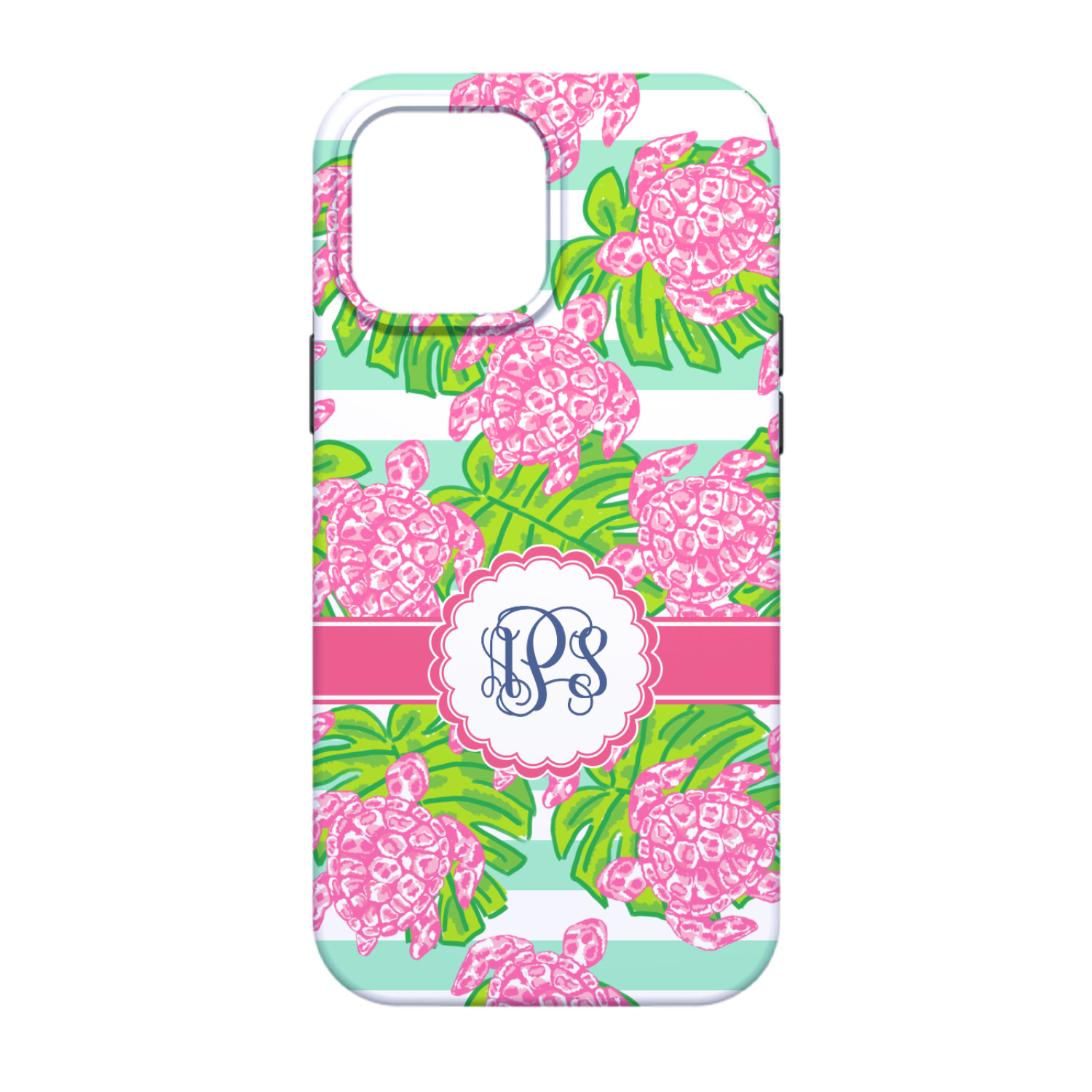 Looking for something Preppy? This design has gorgeous flashy pinks and greens and, of course, monograms! The main design is layered with mint & white stripes, beautiful green leaves and some adorable pink turtles. This will be the perfect design for a typical college girl!
