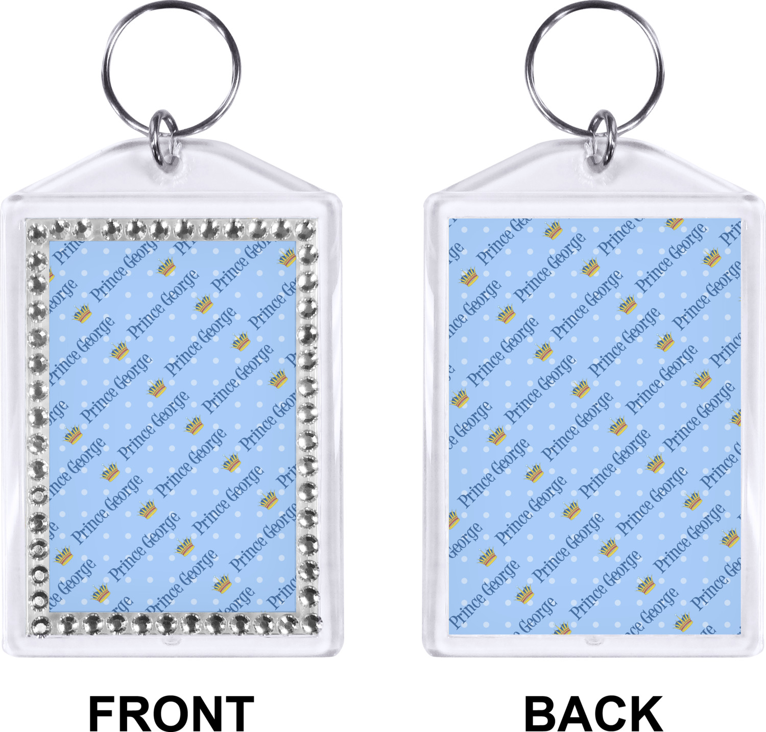 Our personalized keychains have a bold, rectangular shape, outlined by a series of shimmering rhinestones. A metal, split keyring is included with your purchase, and an additional metal hoop allows for attachment of the keychain to the split ring. This unique keychain measures at about 3.75 by 2.5 inches. We print your customized design(s) across both the back and front of this keychain.