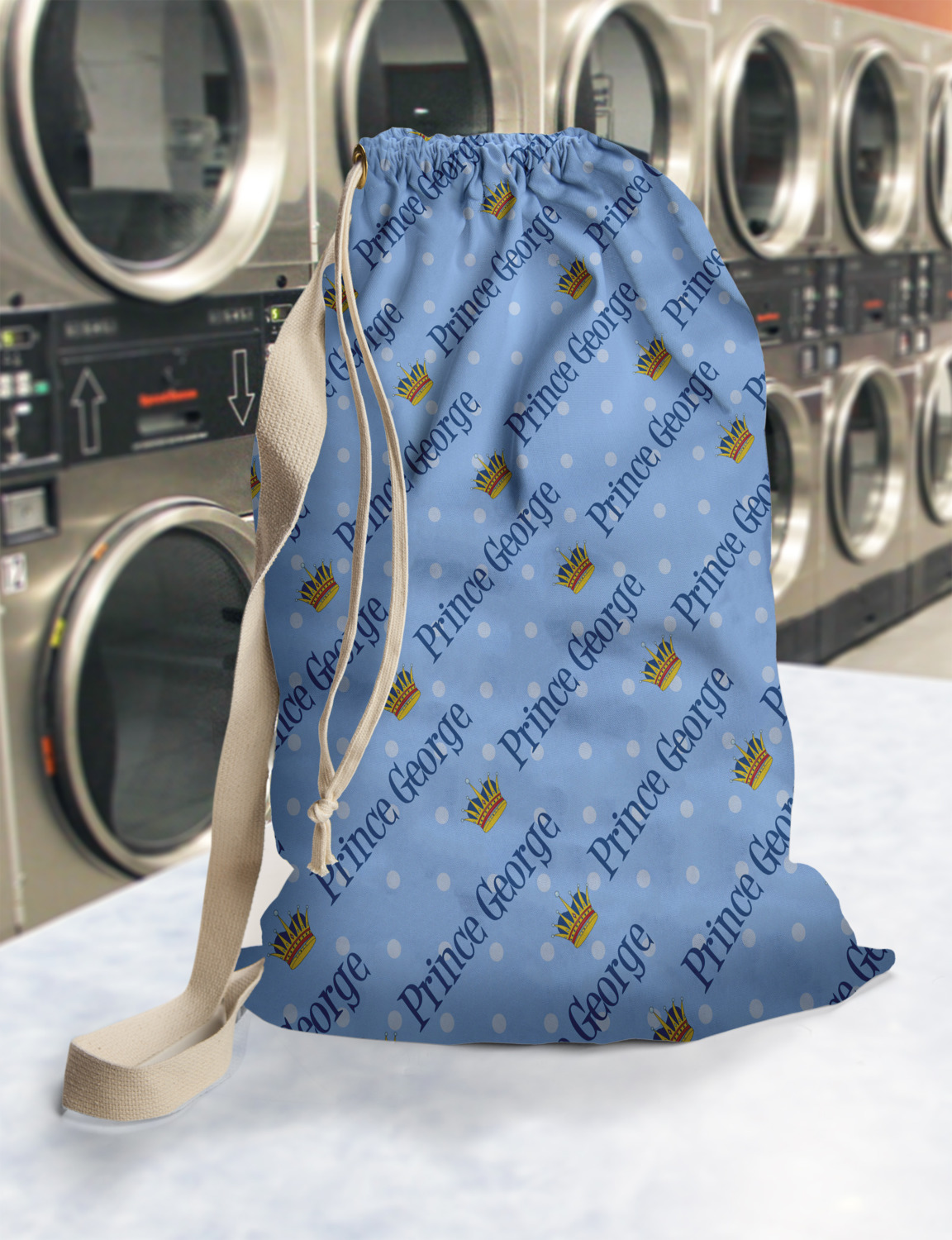 Carry your laundry in style with these customized laundry bags. Available in two sizes, featuring a natural colored woven strap and a cinch cord, these bags hold a lot of clothes or anything else you want to fit in them.