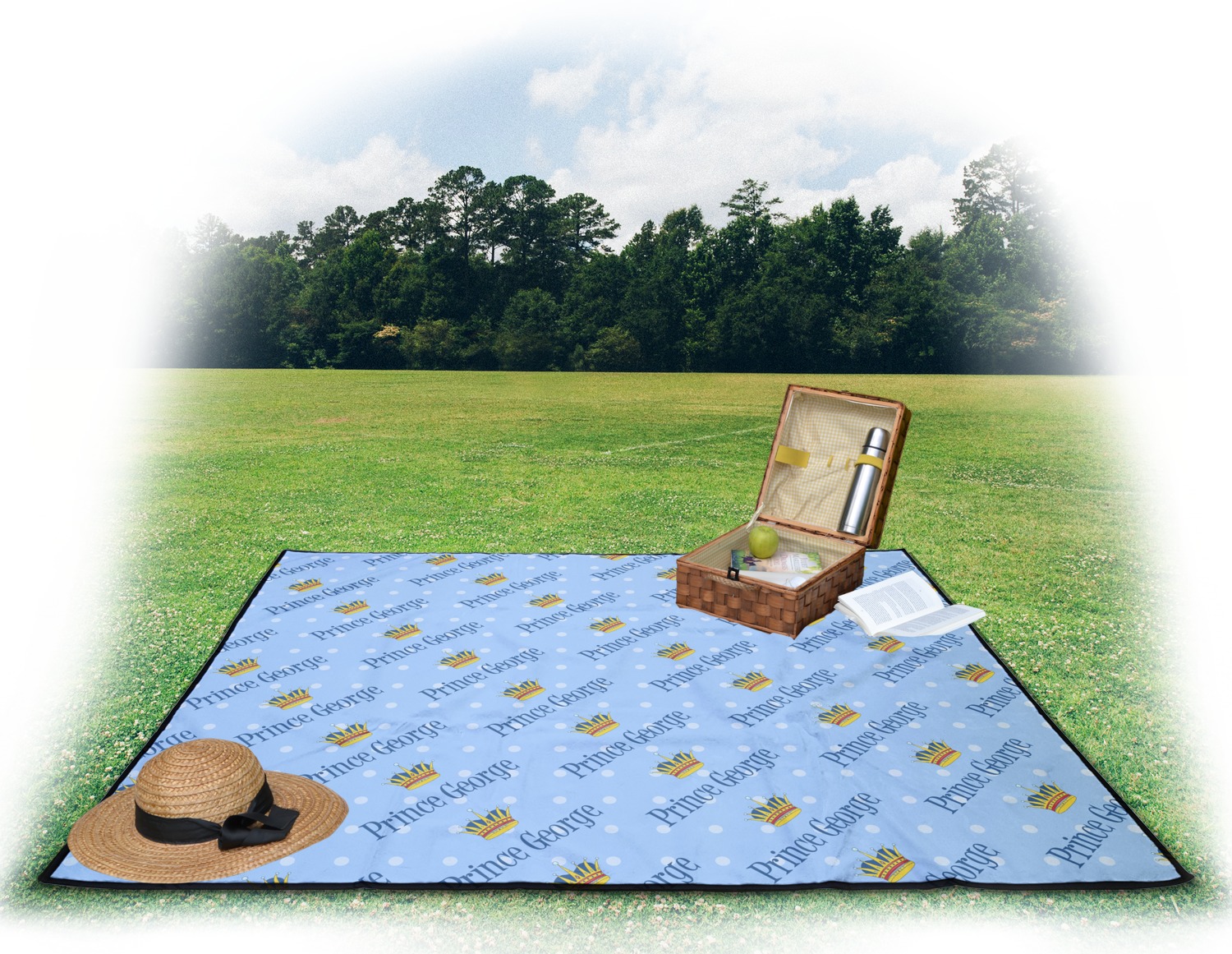 This picnic blanket is perfect for hanging out with your friends at the park or anywhere outside. The top of the blanket is made of a super soft microfiber fleece. The bottom of the blanket is made of a black material similar to a rain jacket and is water repellent as well. This will keep any wet spots on the ground from soaking through your picnic blanket. No one likes a wet blanket. The blanket measures at approximately 50" x 59" and has a nicely finished ribbon edge.