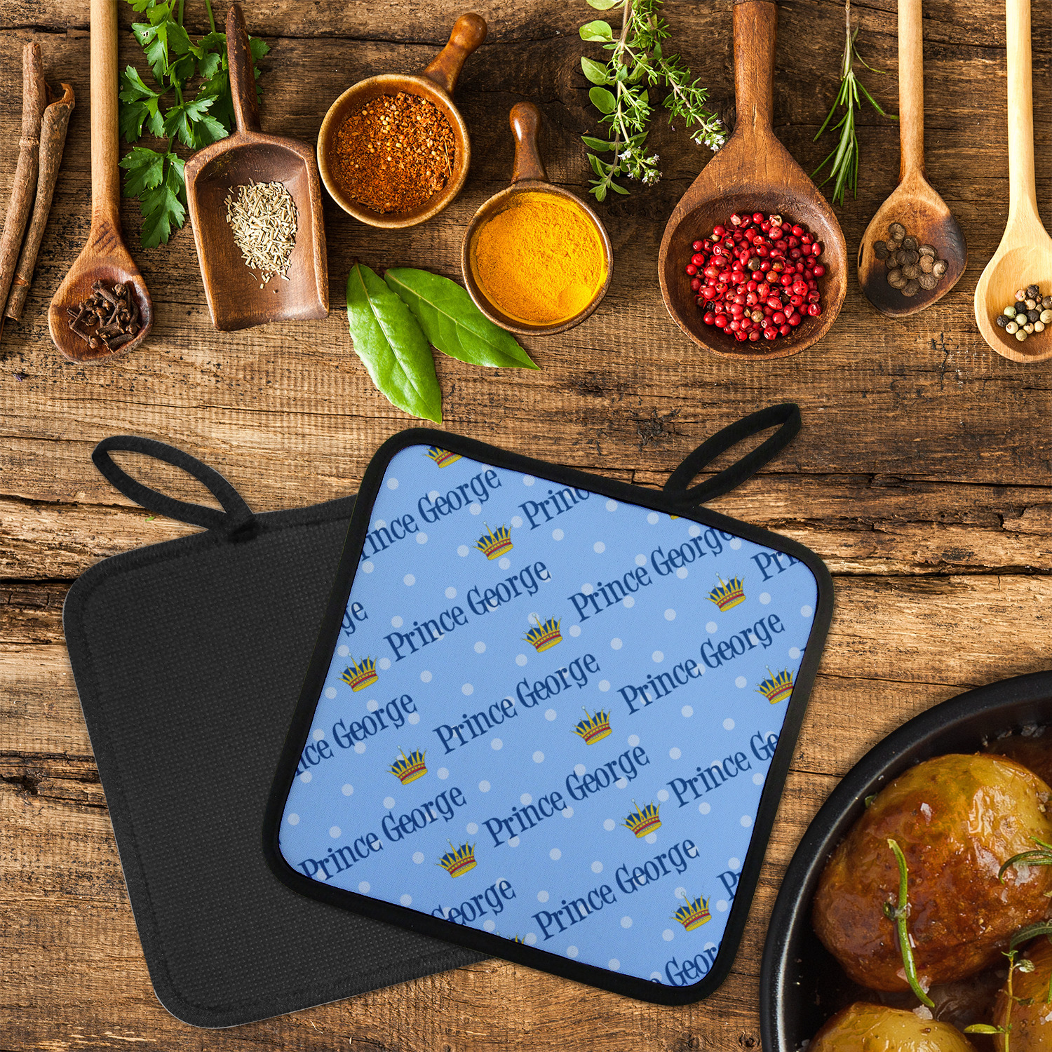 Our personalized pot holders feature a neoprene front that displays your personalization in vibrant colors. The backing of the hot pot holder is rubberized; the textured backing allows you to have a great grip when using this custom pot holder. The two materials are joined with a sleek, black trim, and the holder also includes an attached loop for hanging and storage. The pot holder is approximately 8.75 inches by 8.75 inches and 0.25 inches tall, while the fabric loop is 2.5 inches long. You can purchase a kitchen pot holder by itself or as a set of 2. We also offer a set including one pot holder and one oven mitt.
