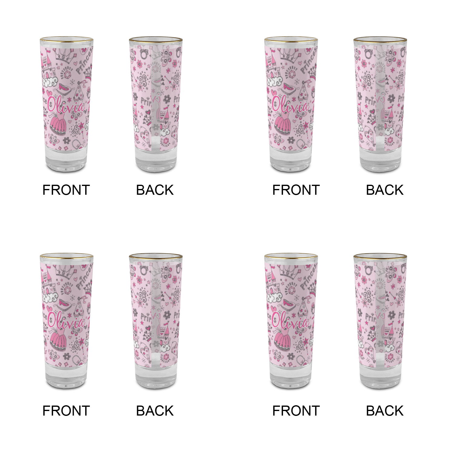 These glass shooter glasses are printed in full color with the design of your choice. These are a tall shooter 2 oz size and stand 4" tall. The print is a full wrap design to boldly display your personalization.