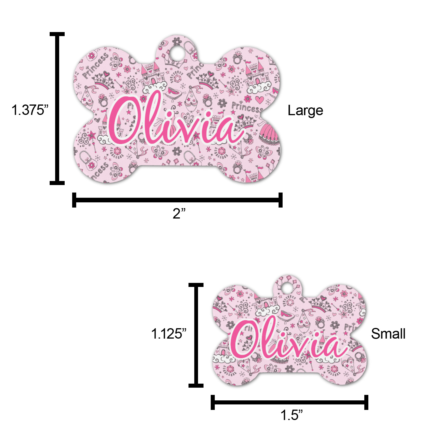 The small bone dog tag size is perfect to pair with our small dog collars, the large size pairs well with our large dog collars.