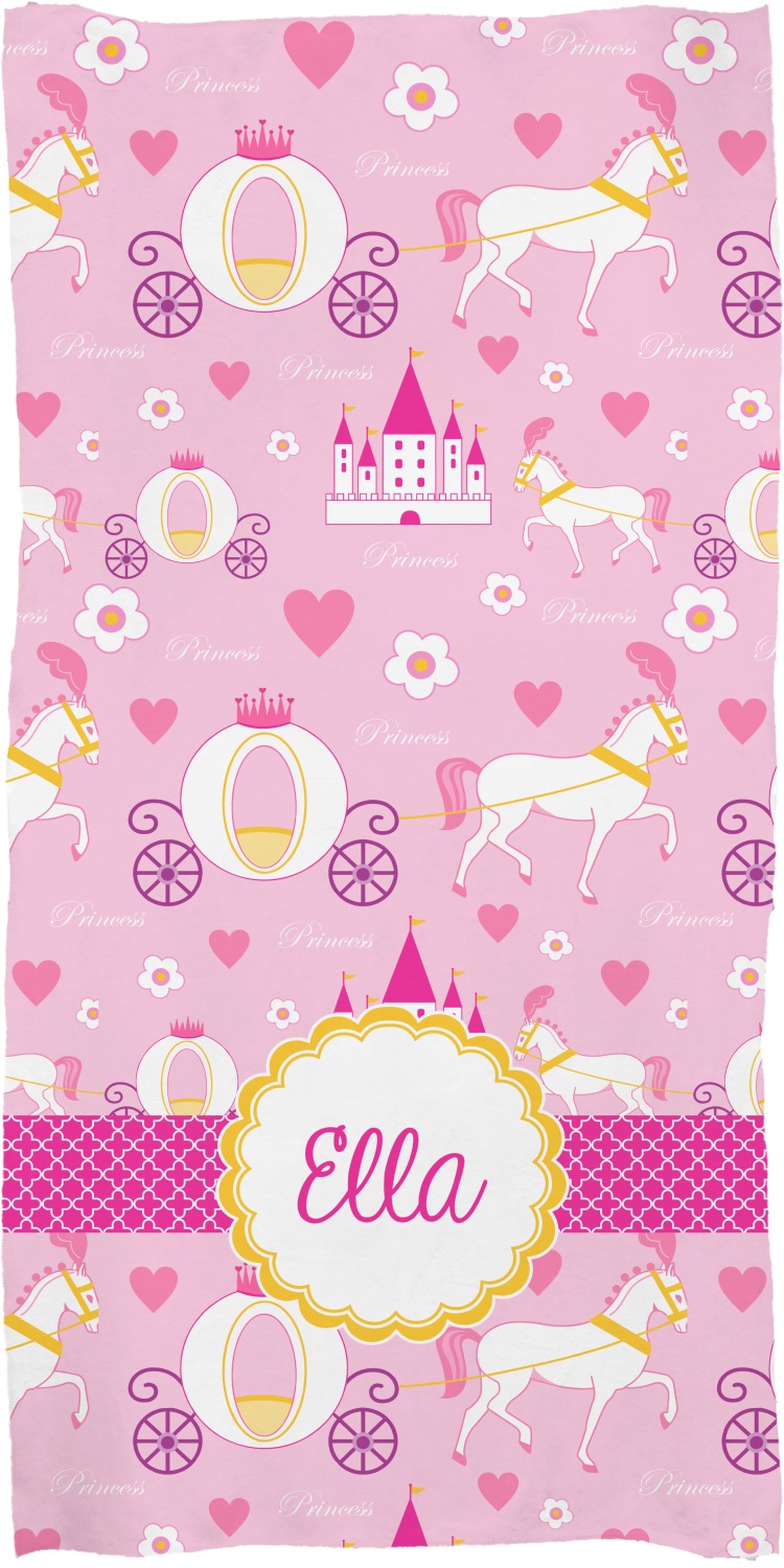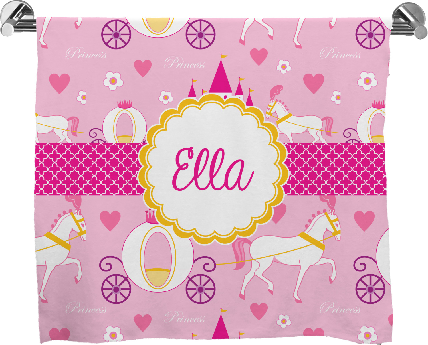 These customized bath towels are slightly larger than your standard towel and are the ideal size for wrapping around your body. They measure approximately 60" x 30". Your customization is displayed across the entire front face of the towel, while the back is white.