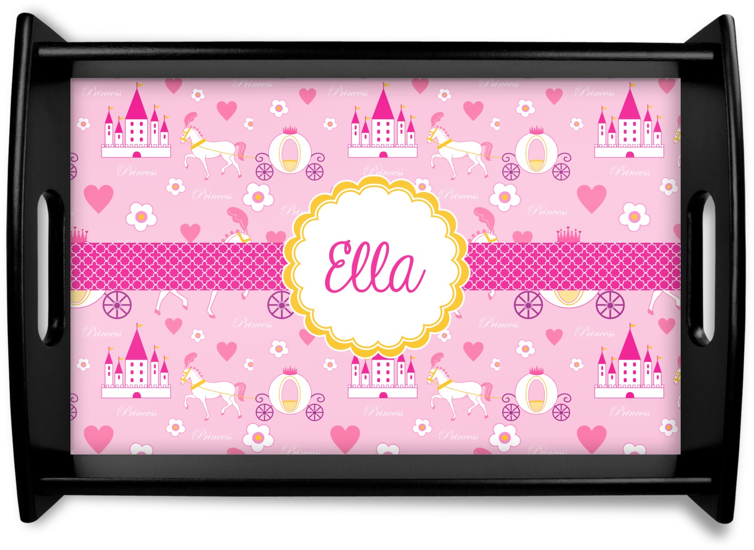 This serving tray with handles features square edges and two rounded sides, creating a very modern look. Each side is fabricated from a beautifully cut, natural wood. The bottom of the interior of the tray displays your customized design in bright, vibrant color. The tray is sold in both a black color and a natural wood look. Each variation of the wood serving tray has two sizes: Small, which is 14" x 10" x 2.25", and Large, which is 19.5" x 13.5" x 2.75".