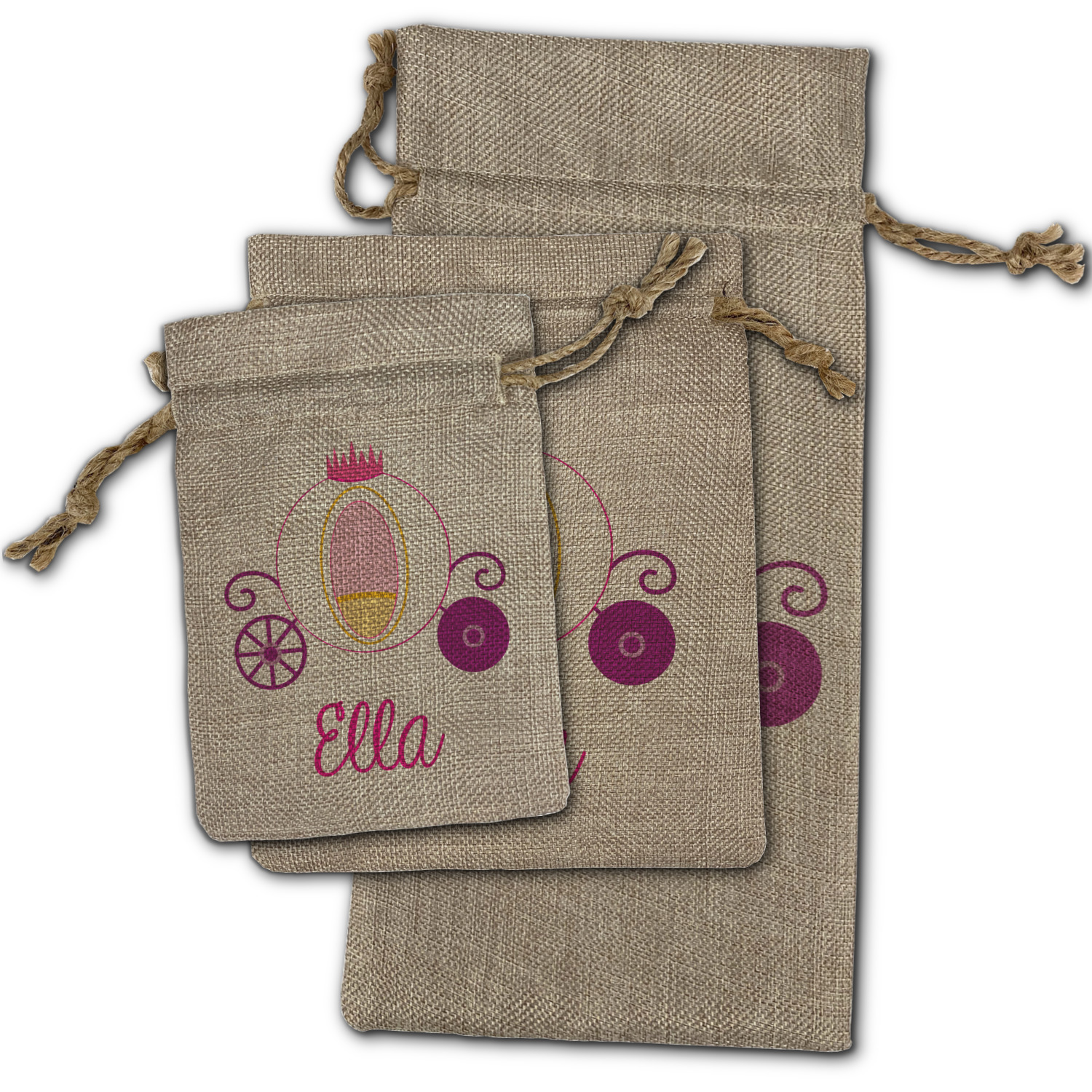 We sell our Burlap Gift Bags in 3 variant sized bags. Made with burlap polyester, each personalized bag can be secured with a twine drawstring pull. Your custom design is available to print on one side or both sides - completely up to you! The sizes of the bags measure approximately 4.5" x 6.5" for the smallest size, 6.5" x 8.0" for the medium size, and 6.5" x 13.5" for the large-sized bag.