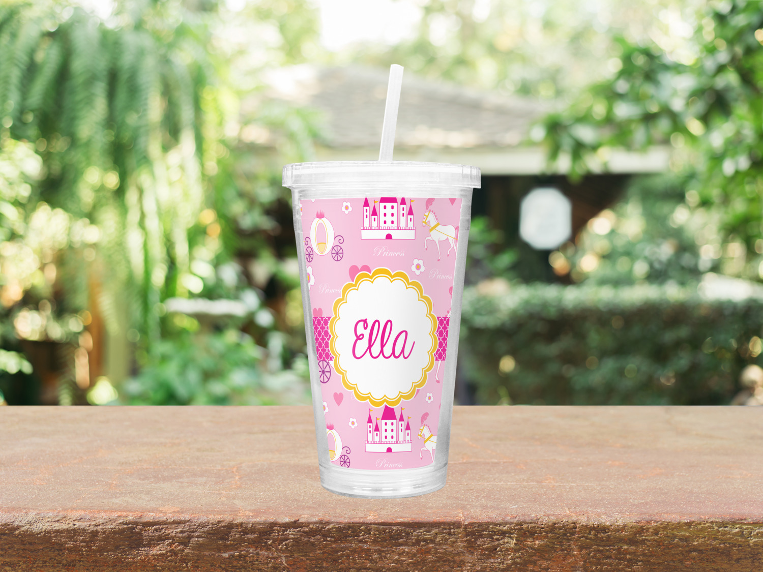 These BPA free tumblers with their double walls keep your drink cold and will not sweat on the outside; they have a clear acrylic top and a reusable straw with a ring around the bottom to keep the straw from falling out.