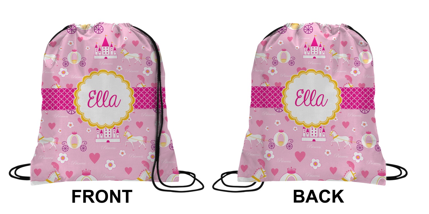 Your custom design will appear on the front and the back of the backpack. You can customize each side individually. The inside of the backpack is white and the drawstrings are black. The back pack is made of 100% polyester fabric.