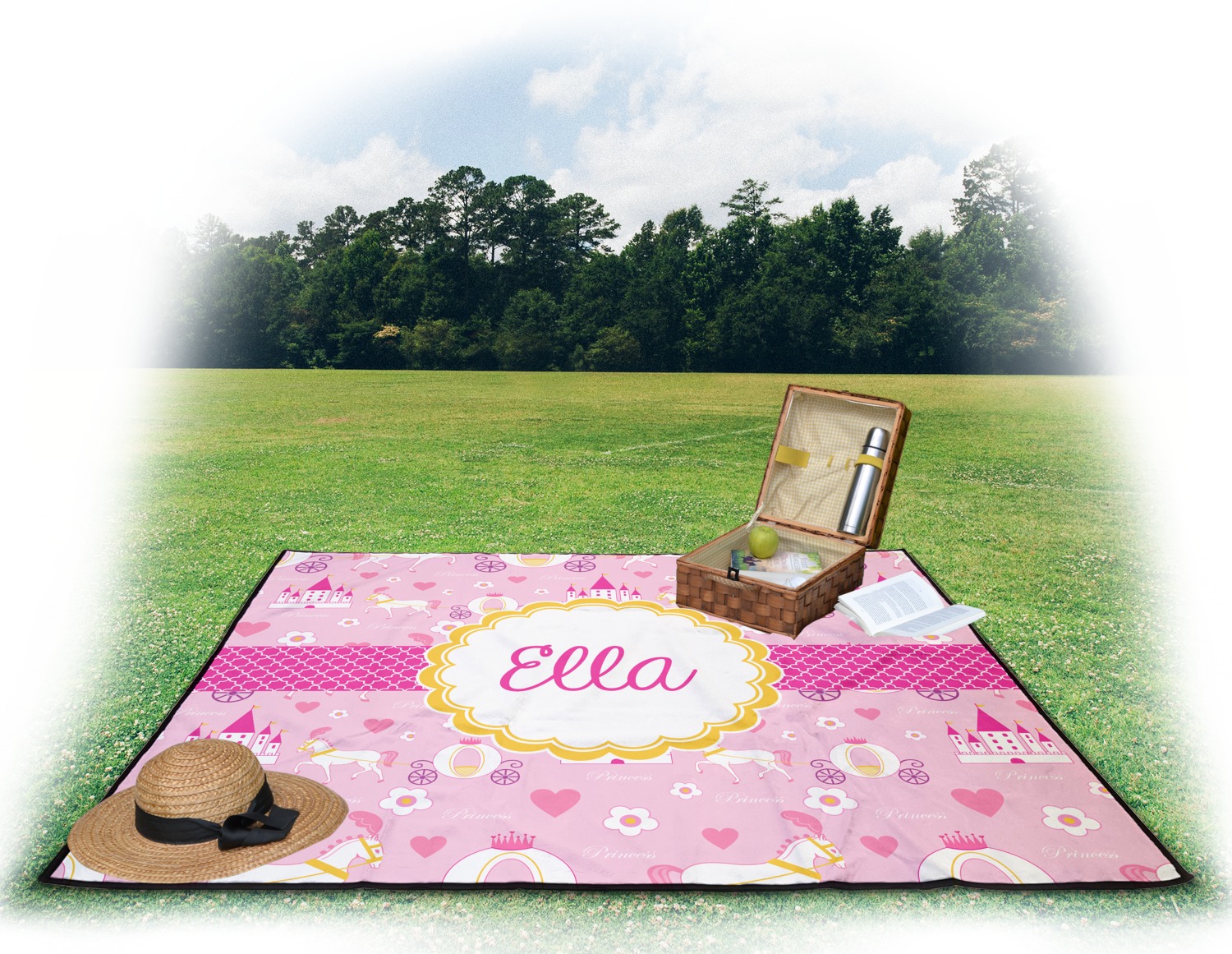 This picnic blanket is perfect for hanging out with your friends at the park or anywhere outside. The top of the blanket is made of a super soft microfiber fleece. The bottom of the blanket is made of a black material similar to a rain jacket and is water repellent as well. This will keep any wet spots on the ground from soaking through your picnic blanket. No one likes a wet blanket. The blanket measures at approximately 50" x 59" and has a nicely finished ribbon edge.