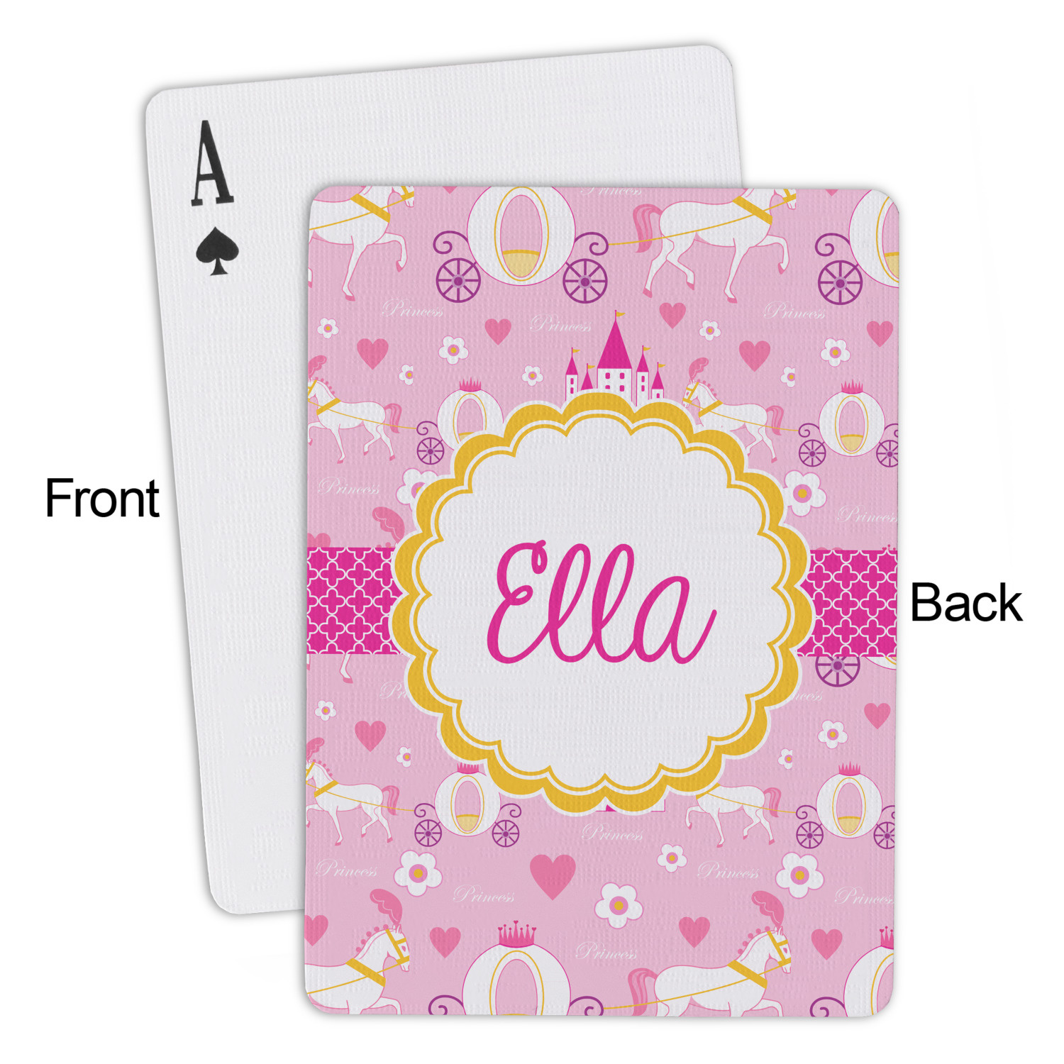 The customization / personalization is printed on the back side. The playing cards have a low gloss coating on both sides. The cards are packaged in a clear plastic box.