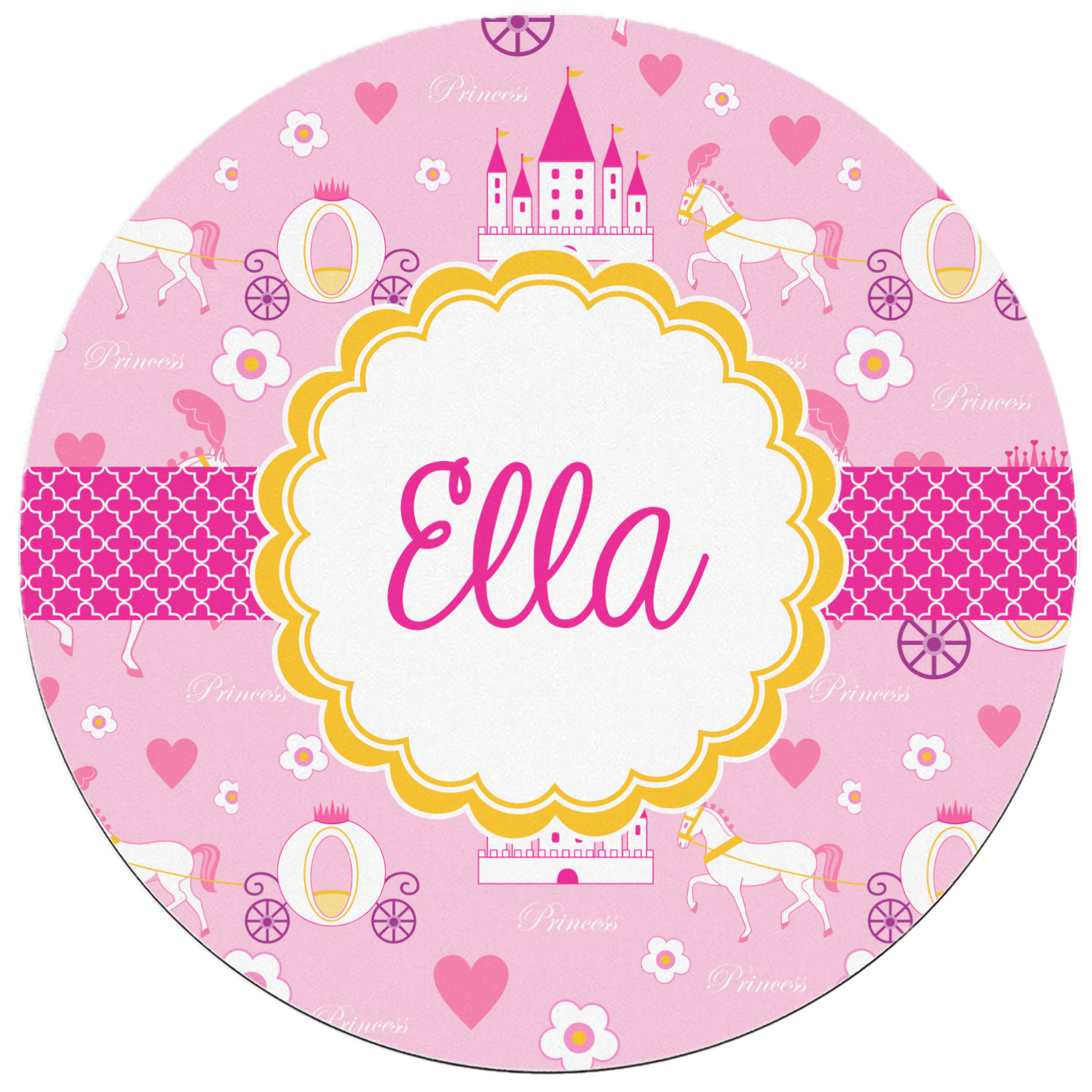 The center piece of the design is a yellow scalloped label, the perfect place for the name of a princess.
