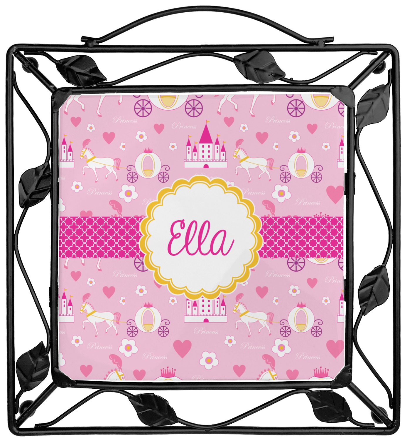 The center piece of the design is a yellow scalloped label, the perfect place for the name of a princess.