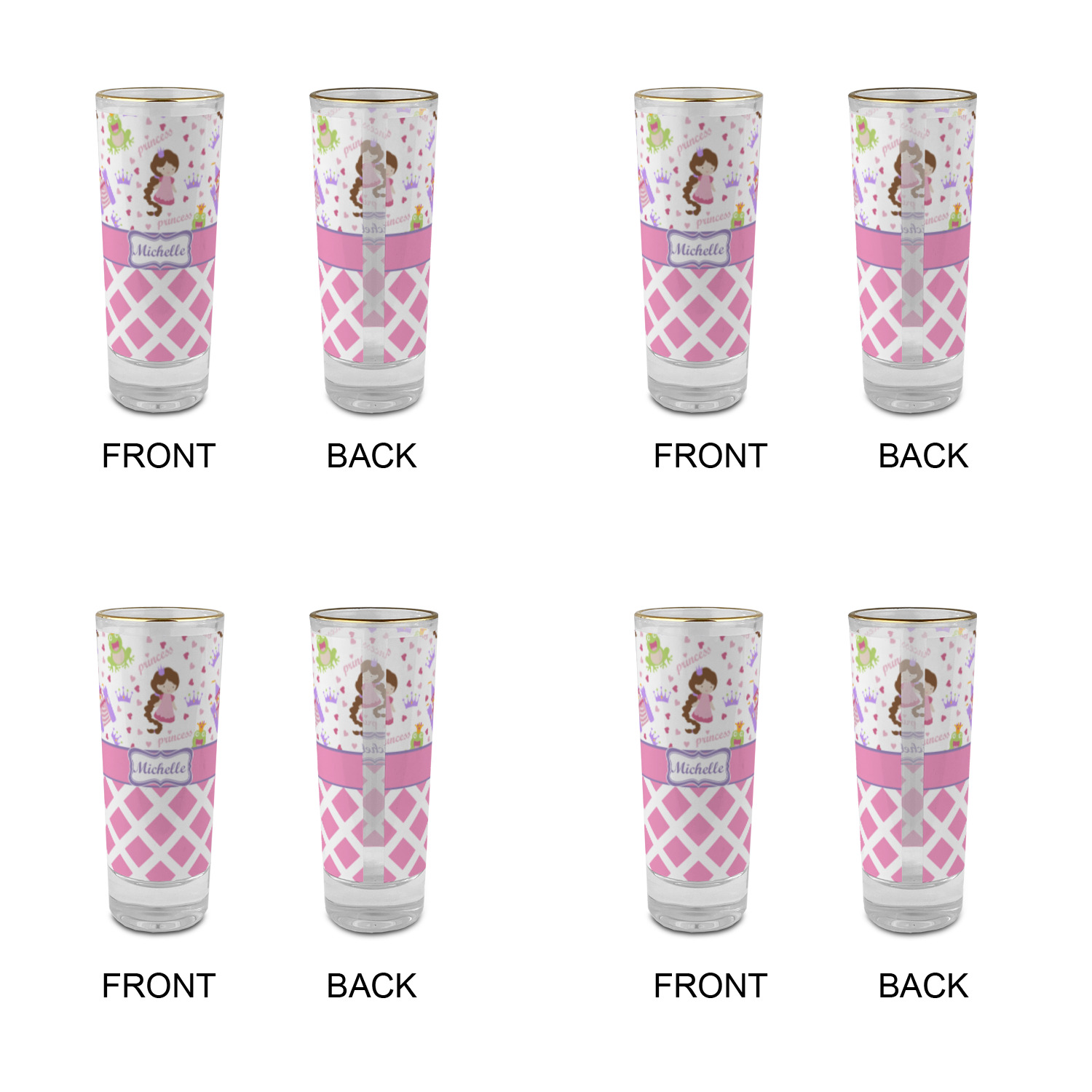 These glass shooter glasses are printed in full color with the design of your choice. These are a tall shooter 2 oz size and stand 4" tall. The print is a full wrap design to boldly display your personalization.