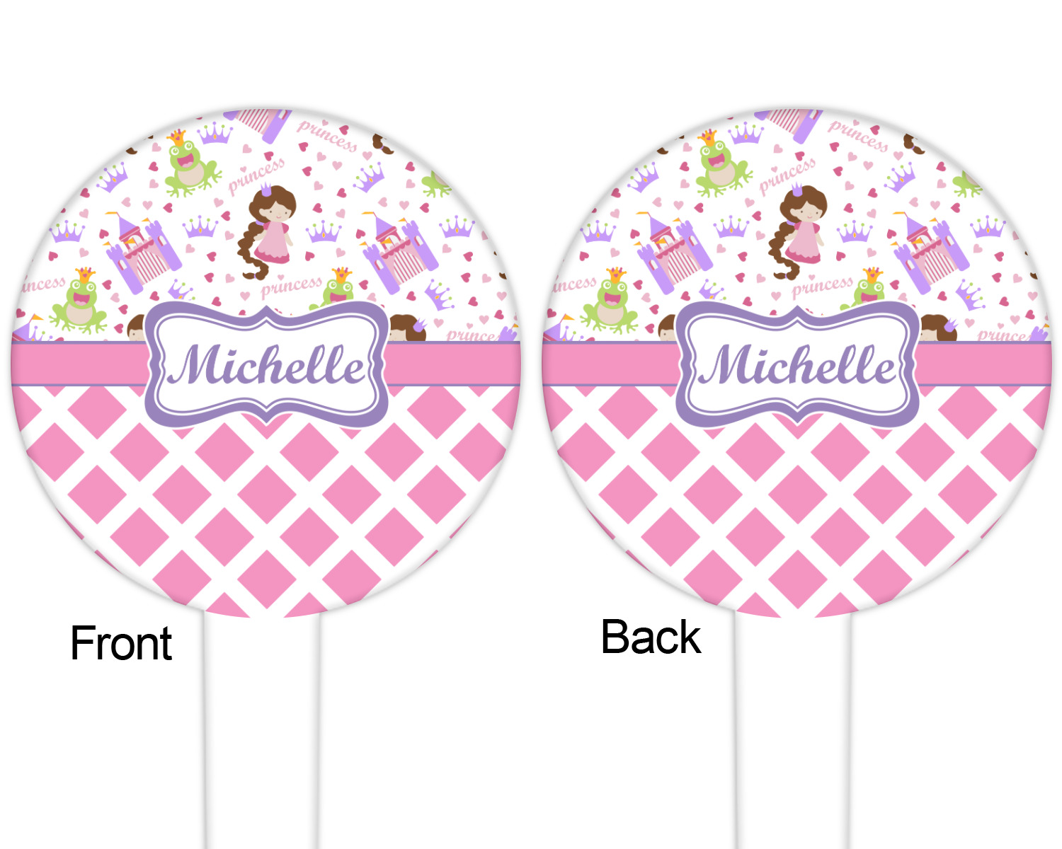 The little princess, dressed in various shades of pink, is wearing a coordinating purple crown and hair tie. A wide pink band trimmed in purple pull the pattern together and help to showcase the personalized princess in a circle label.
