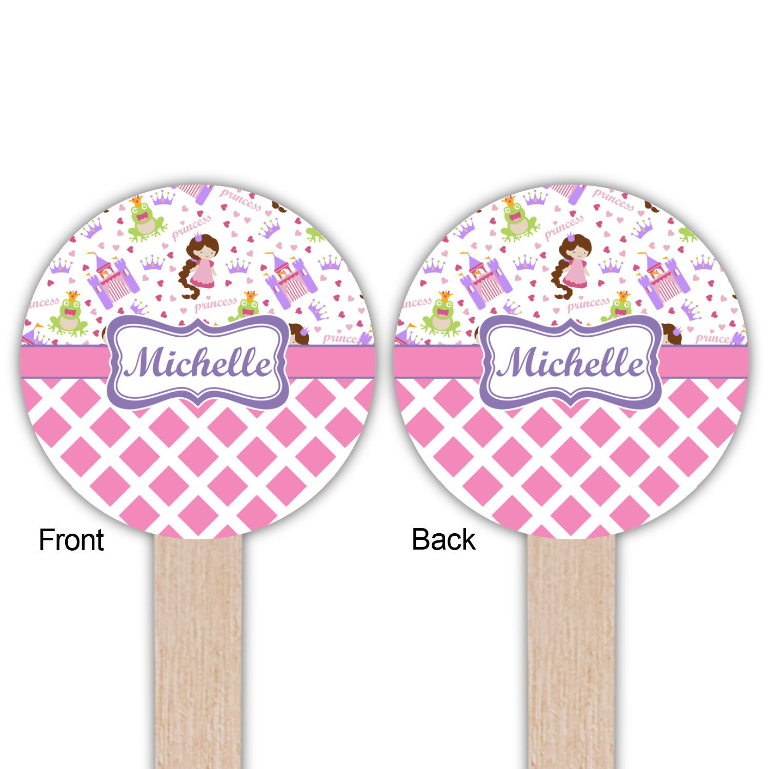 The little princess, dressed in various shades of pink, is wearing a coordinating purple crown and hair tie. A wide pink band trimmed in purple pull the pattern together and help to showcase the personalized princess in a circle label.