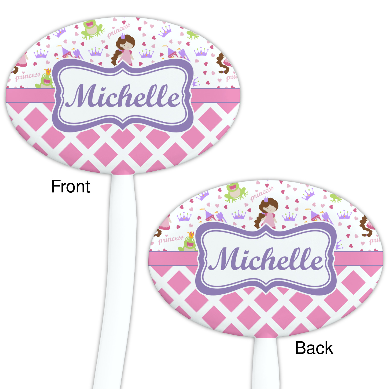 The little princess, dressed in various shades of pink, is wearing a coordinating purple crown and hair tie. A wide pink band trimmed in purple pull the pattern together and help to showcase the personalized princess in a circle label.