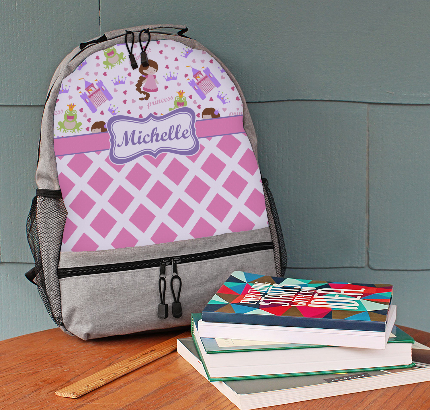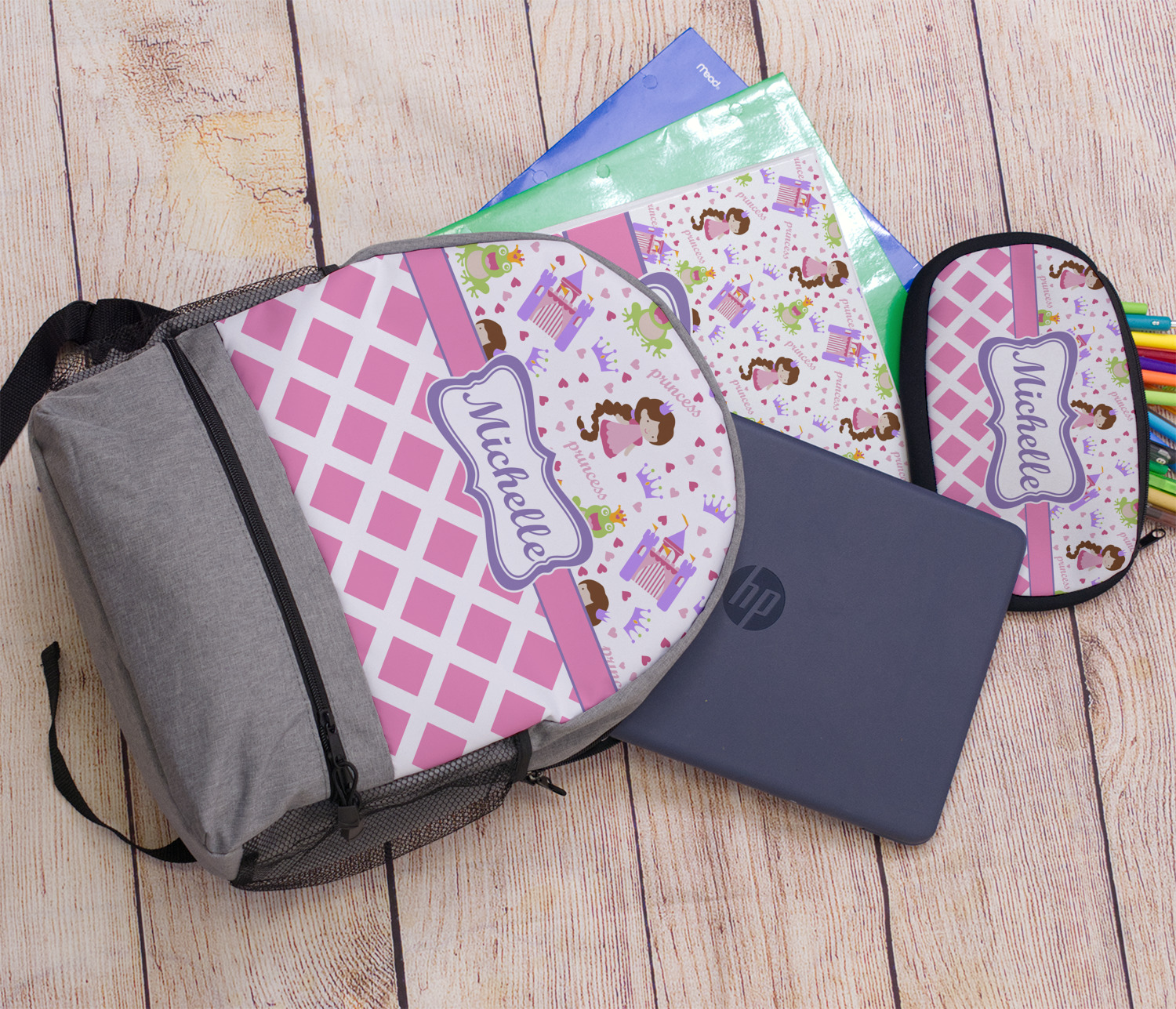 The little princess, dressed in various shades of pink, is wearing a coordinating purple crown and hair tie. A wide pink band trimmed in purple pull the pattern together and help to showcase the personalized princess in a circle label.