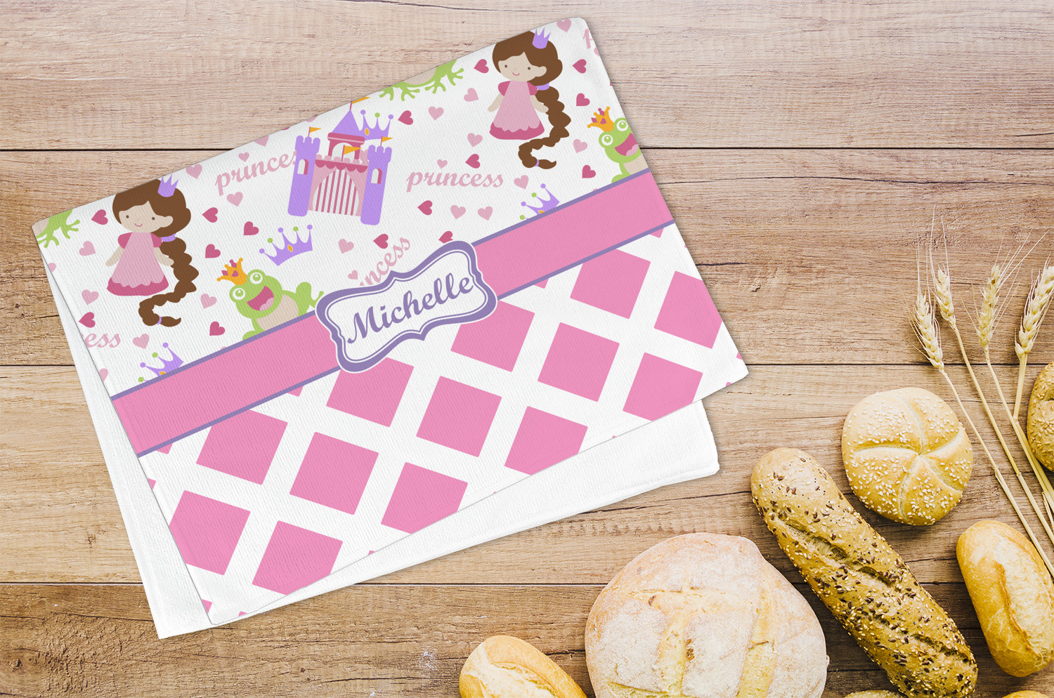 The little princess, dressed in various shades of pink, is wearing a coordinating purple crown and hair tie. A wide pink band trimmed in purple pull the pattern together and help to showcase the personalized princess in a circle label.
