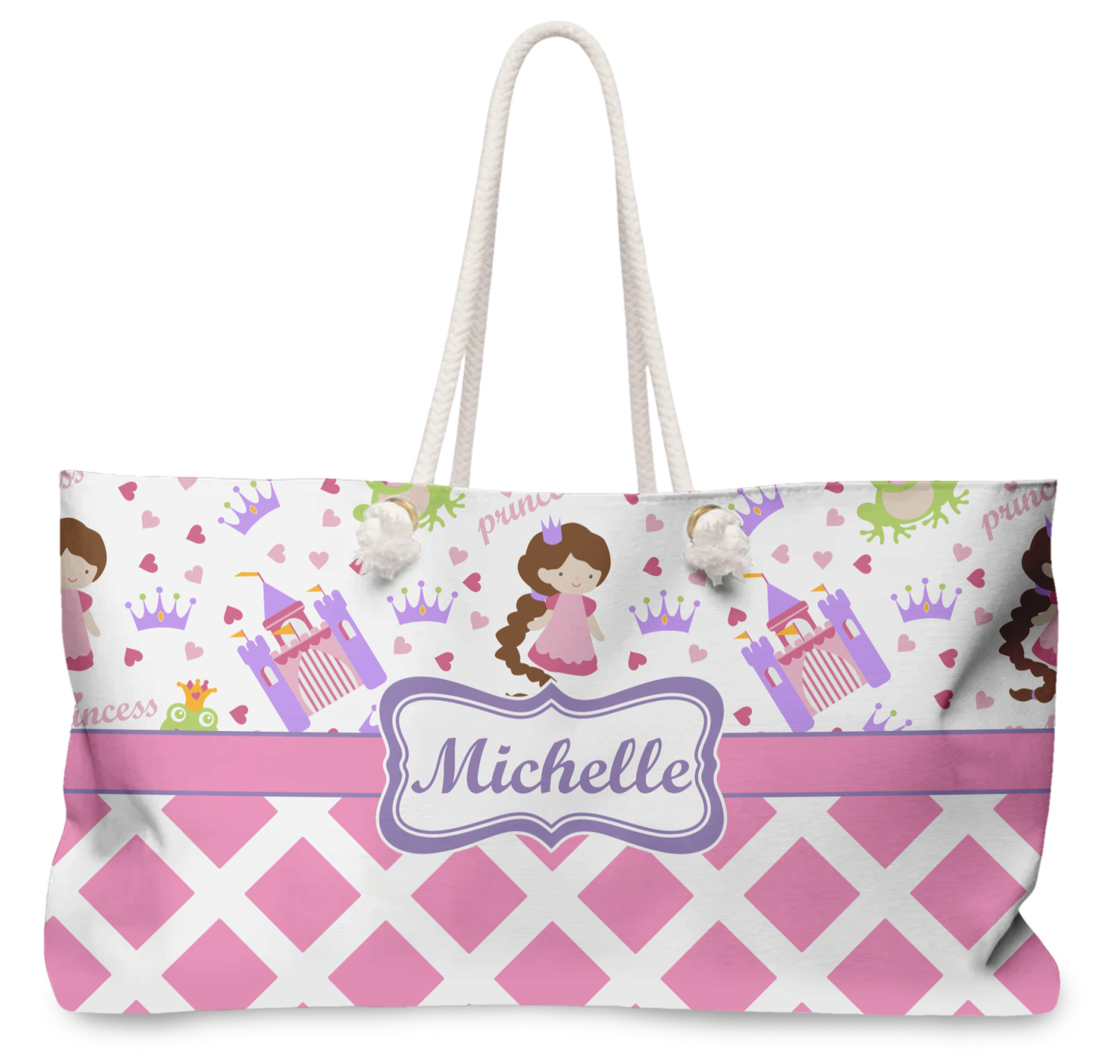 Our oversized weekender tote with rope handles is perfect for your weekend at the beach or on the town. This large tote are 24" W X 13" H, with a 5" gusset and a 27" thick rope handles with a knot that is put through a grommeted brass hole.