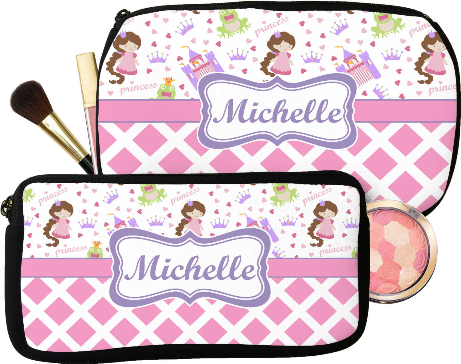 Our personalized makeup bags are available in many different designs, patterns and colors - so you are sure to find one that will love. They are made of neoprene (same material as wet-suits) and thus are water resistant, so spillages in your makeup bag will not end up all over you purse. They are customized on one side and are black on the other side and the zipper is black as well.