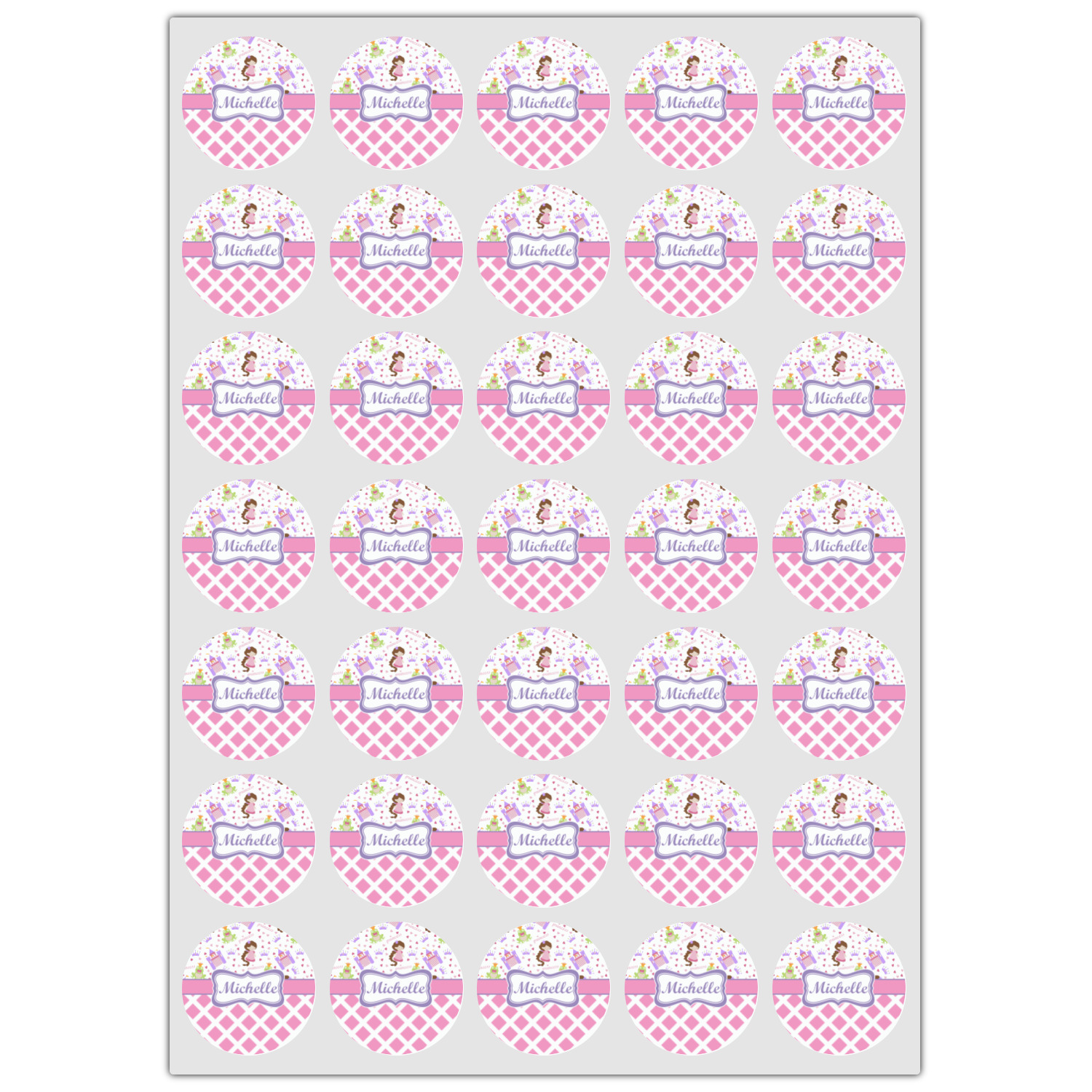 The little princess, dressed in various shades of pink, is wearing a coordinating purple crown and hair tie. A wide pink band trimmed in purple pull the pattern together and help to showcase the personalized princess in a circle label.