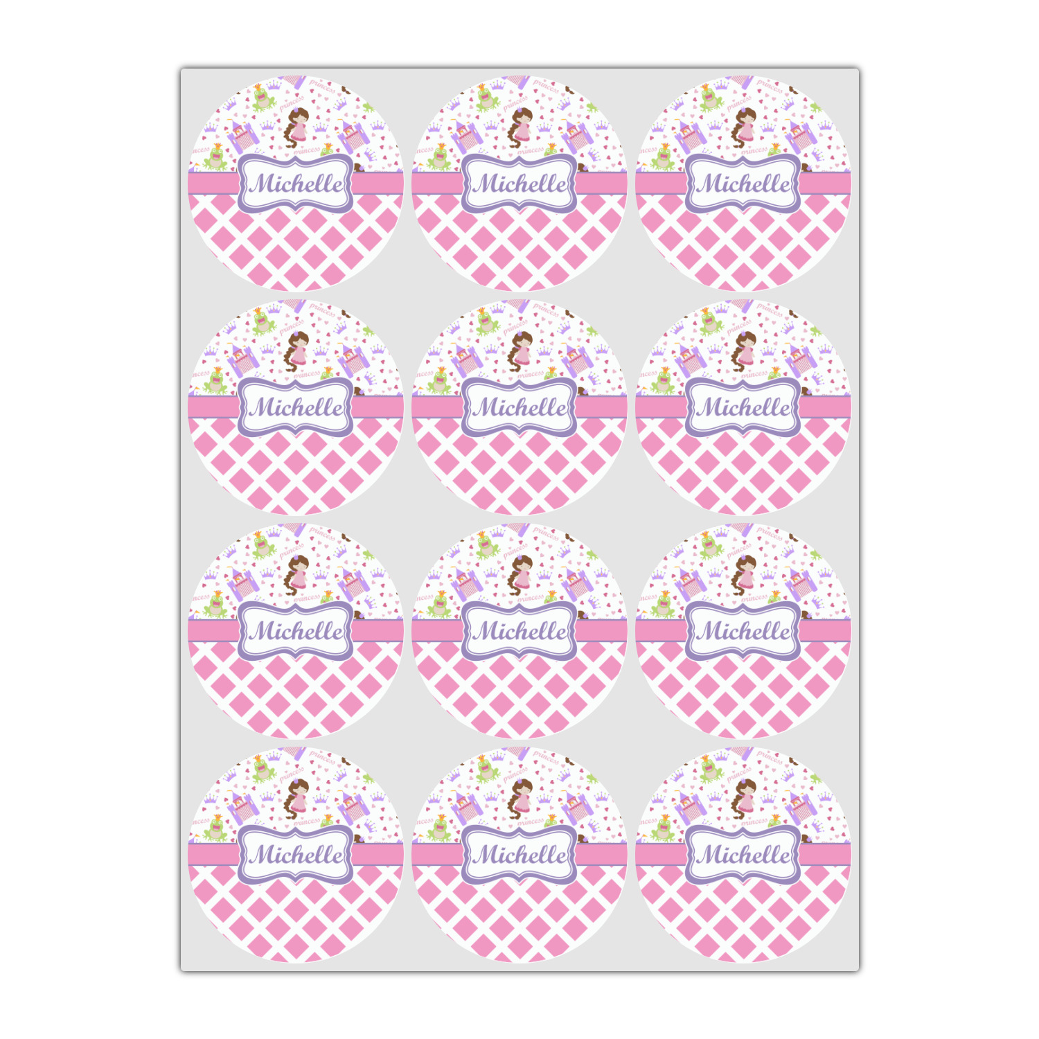 The little princess, dressed in various shades of pink, is wearing a coordinating purple crown and hair tie. A wide pink band trimmed in purple pull the pattern together and help to showcase the personalized princess in a circle label.