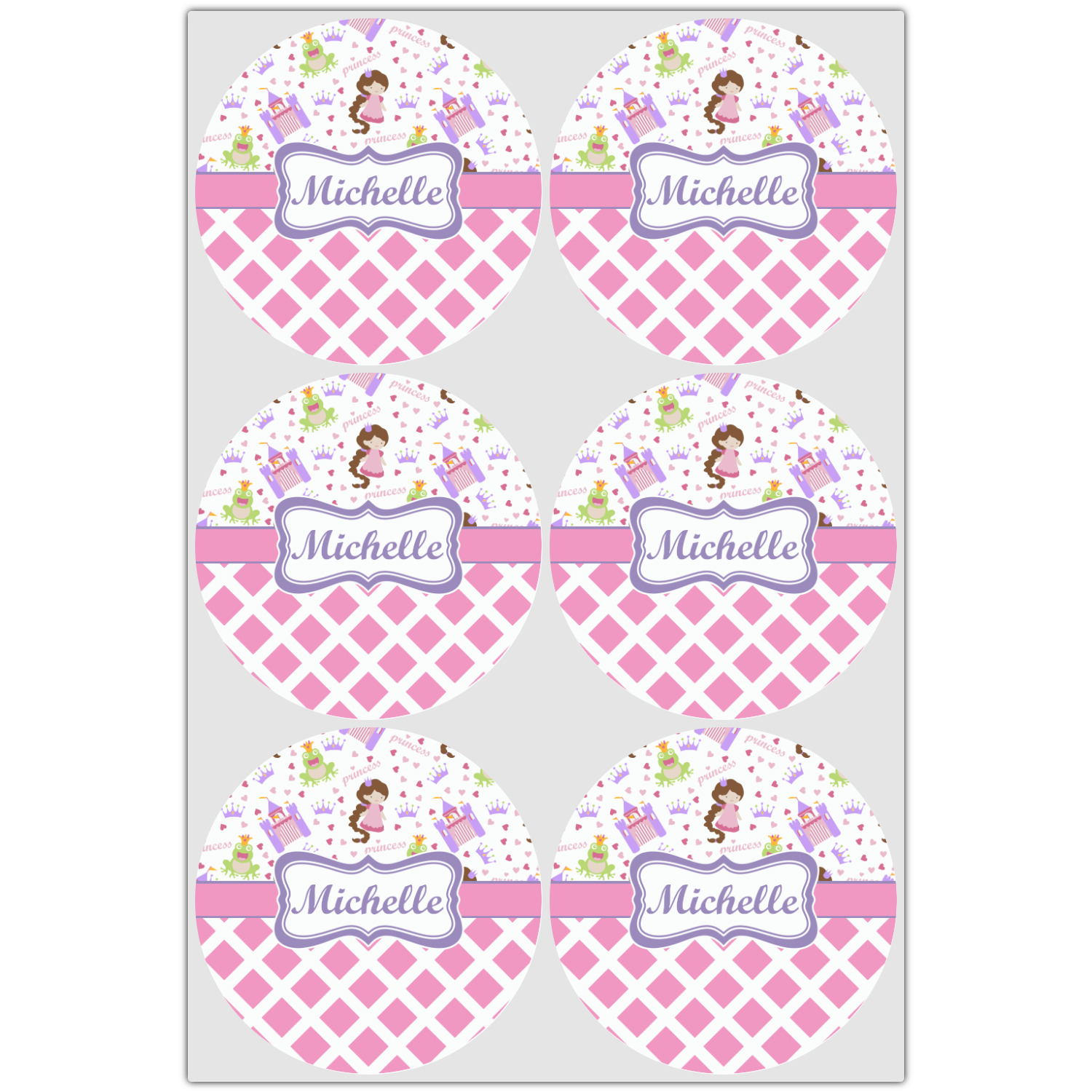 The little princess, dressed in various shades of pink, is wearing a coordinating purple crown and hair tie. A wide pink band trimmed in purple pull the pattern together and help to showcase the personalized princess in a circle label.