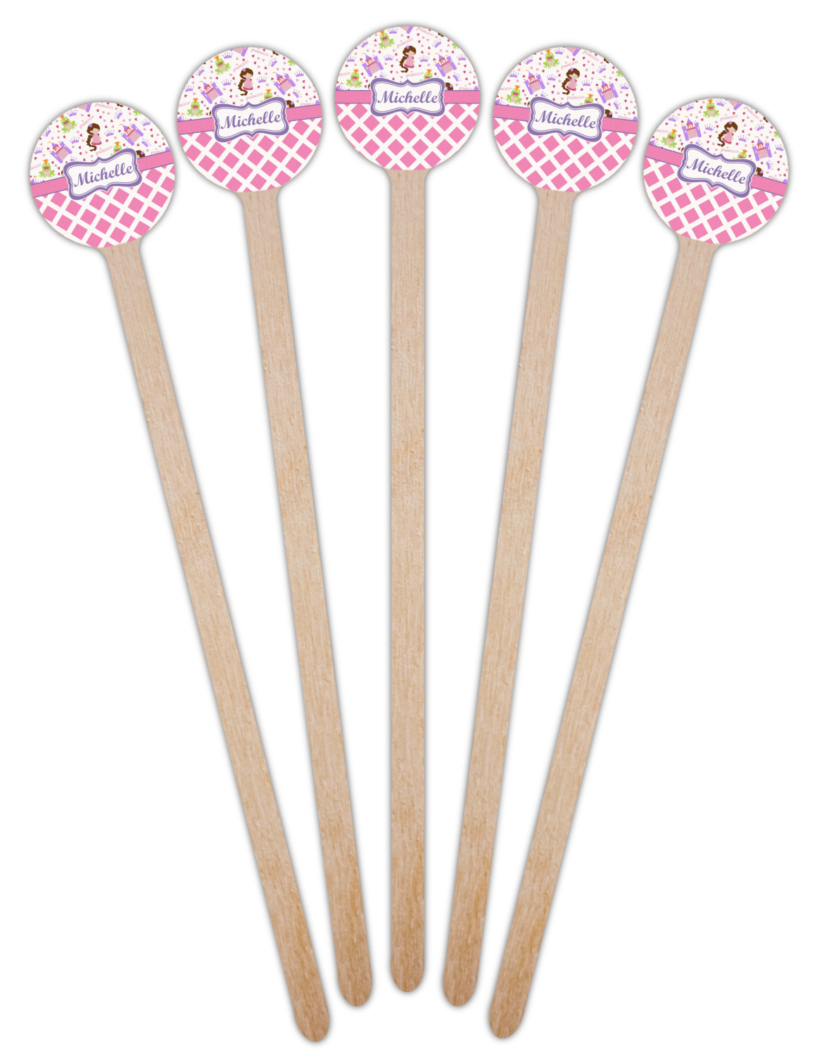 The little princess, dressed in various shades of pink, is wearing a coordinating purple crown and hair tie. A wide pink band trimmed in purple pull the pattern together and help to showcase the personalized princess in a circle label.