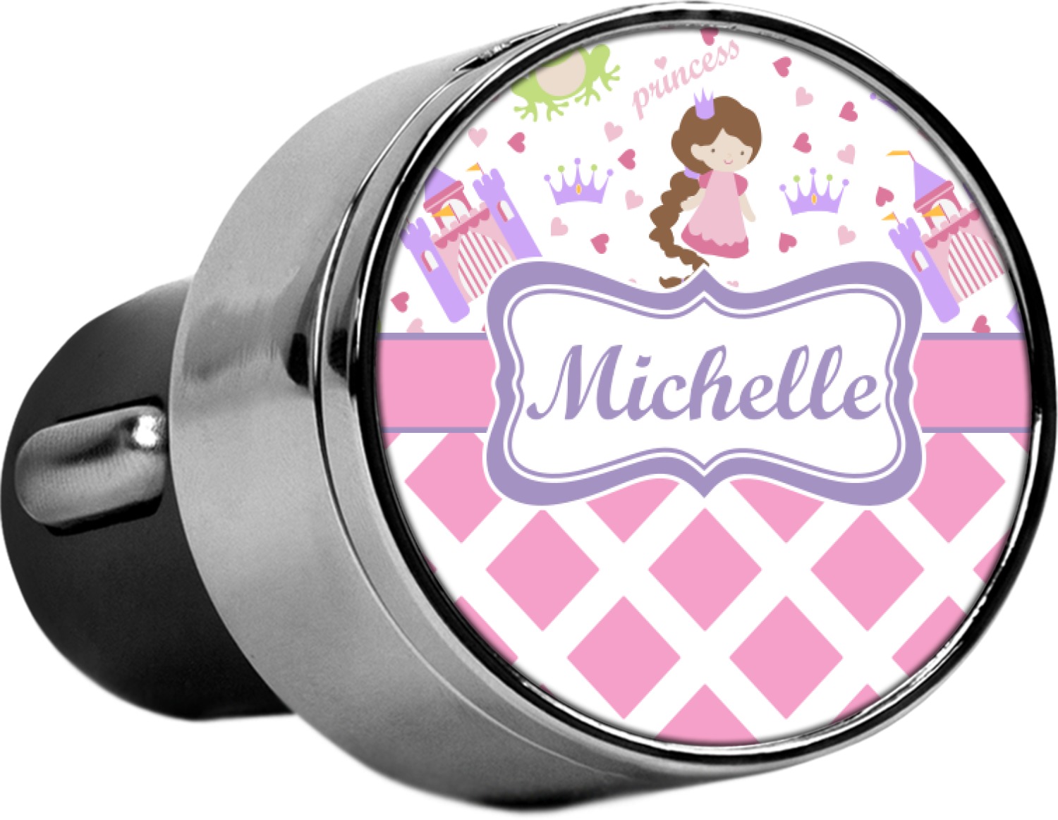 This car charger adapter converts your cars bland cigarette lighter into a decorative, personalized, and operational USB charging port. Made of solid, silver-plated metal, these chargers feature a flip-open lid that both displays your customized design and conceals two USB ports. The metal lid of the USB car charger adapter is 1.5" in diameter and seals due to a small, ingrained magnet on both the charger and its lid. The cigarette lighter insert, itself, is colored black.