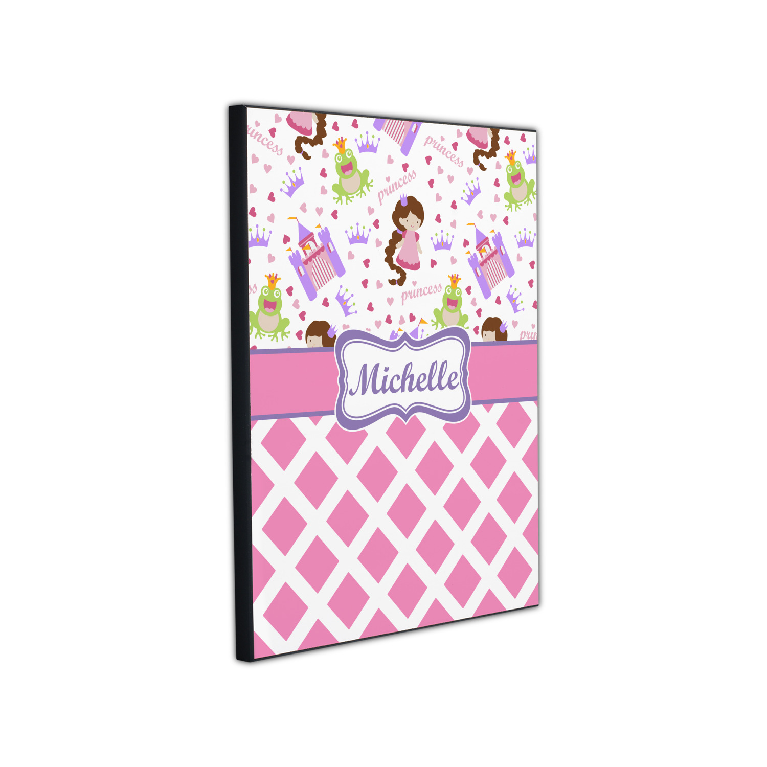 The little princess, dressed in various shades of pink, is wearing a coordinating purple crown and hair tie. A wide pink band trimmed in purple pull the pattern together and help to showcase the personalized princess in a circle label.