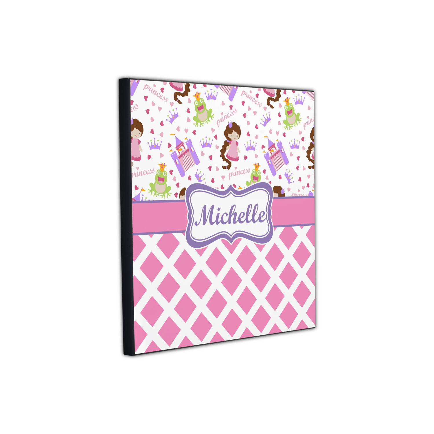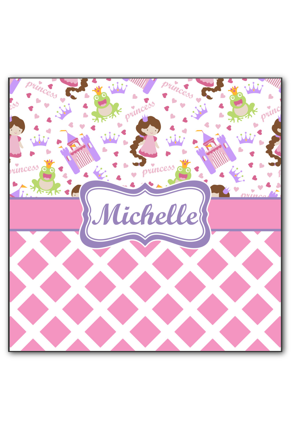 The little princess, dressed in various shades of pink, is wearing a coordinating purple crown and hair tie. A wide pink band trimmed in purple pull the pattern together and help to showcase the personalized princess in a circle label.