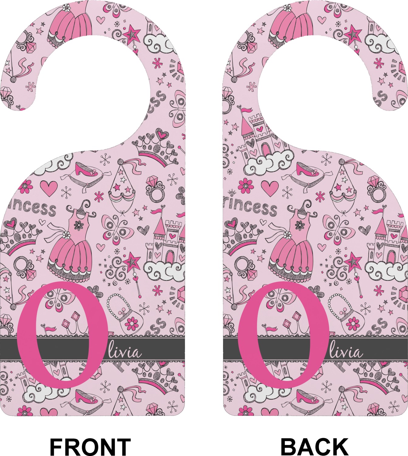 We chose to personalized the design with our Large Initial and Text on Ribbon Style. We chose the scalloped ribbon, and dark pink and dark grey for our colors. We have many princesses & women in our system - you can choose any one of those and customize to suit your personal style.