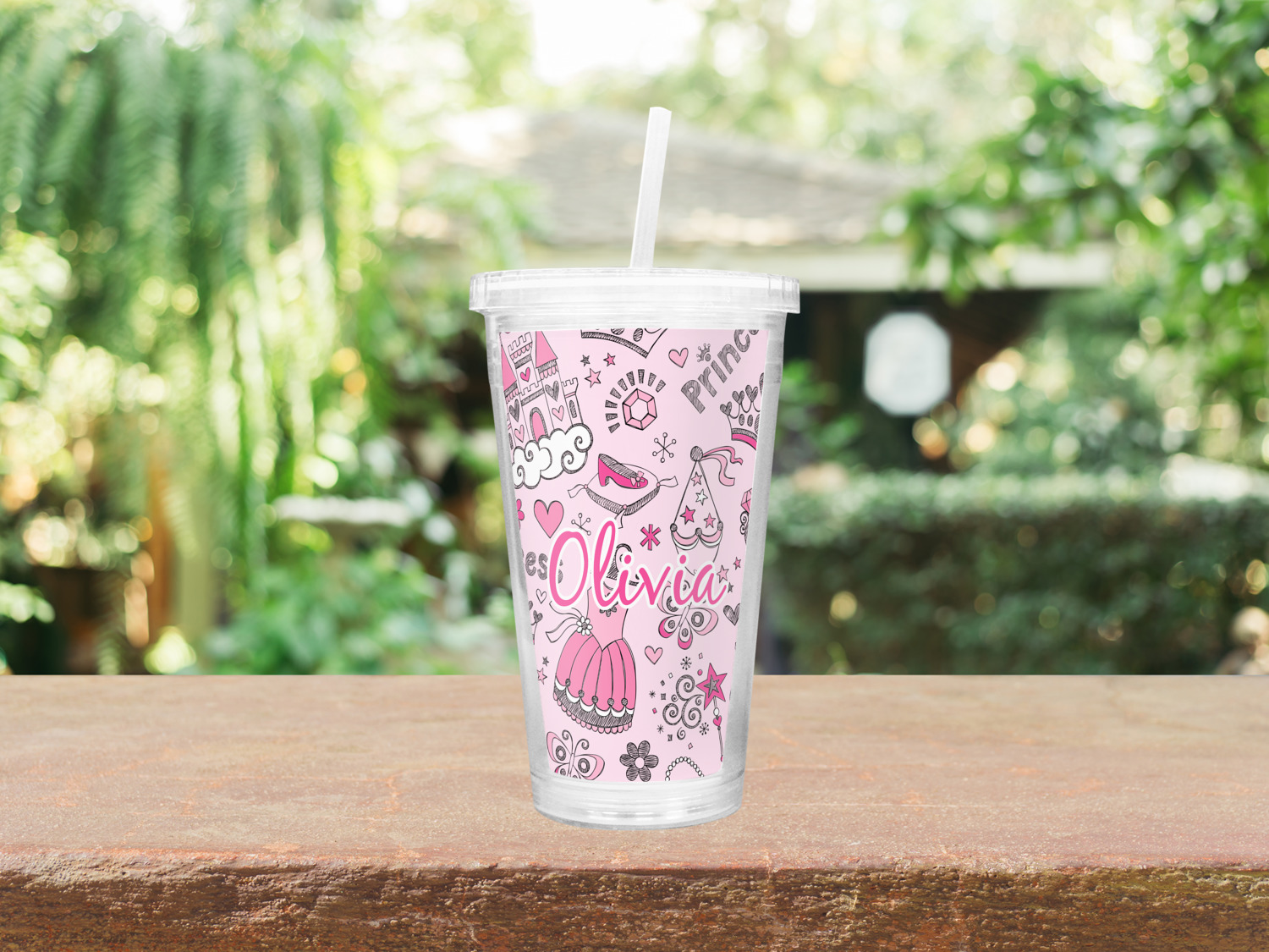 These BPA free tumblers with their double walls keep your drink cold and will not sweat on the outside; they have a clear acrylic top and a reusable straw with a ring around the bottom to keep the straw from falling out.