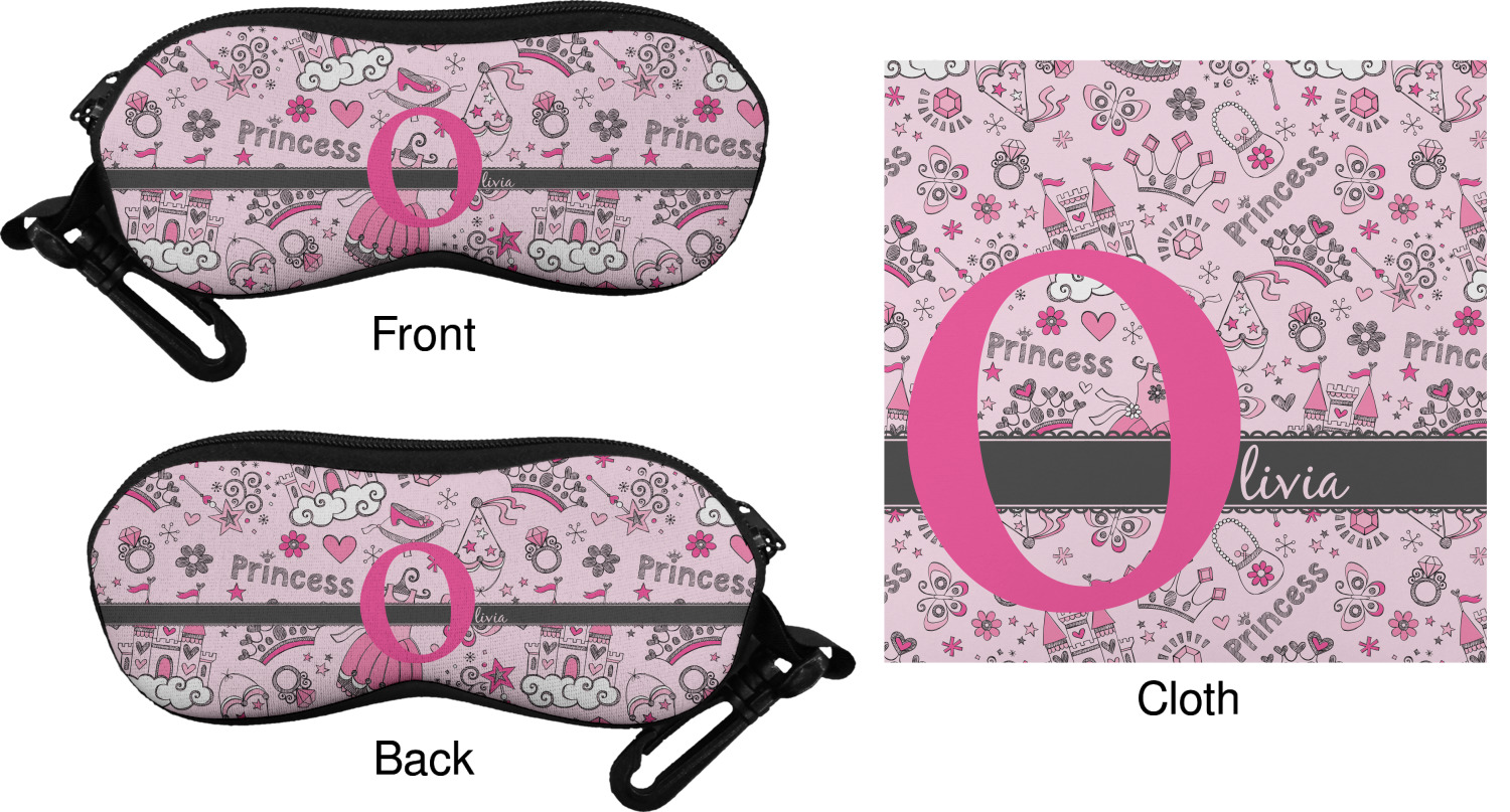 The cases have the design on both sides, a black zipper, and clips for hanging on a belt buckle or purse strap and also include matching lens cloths.