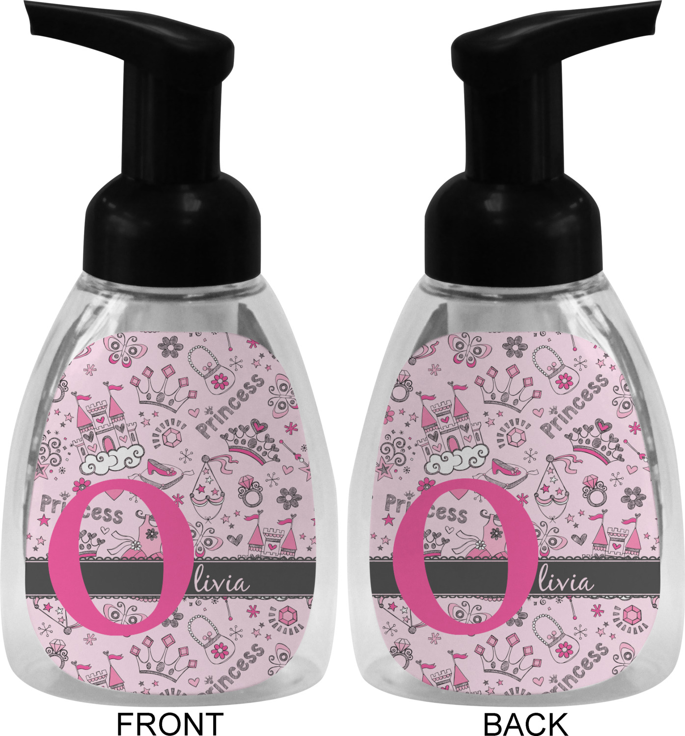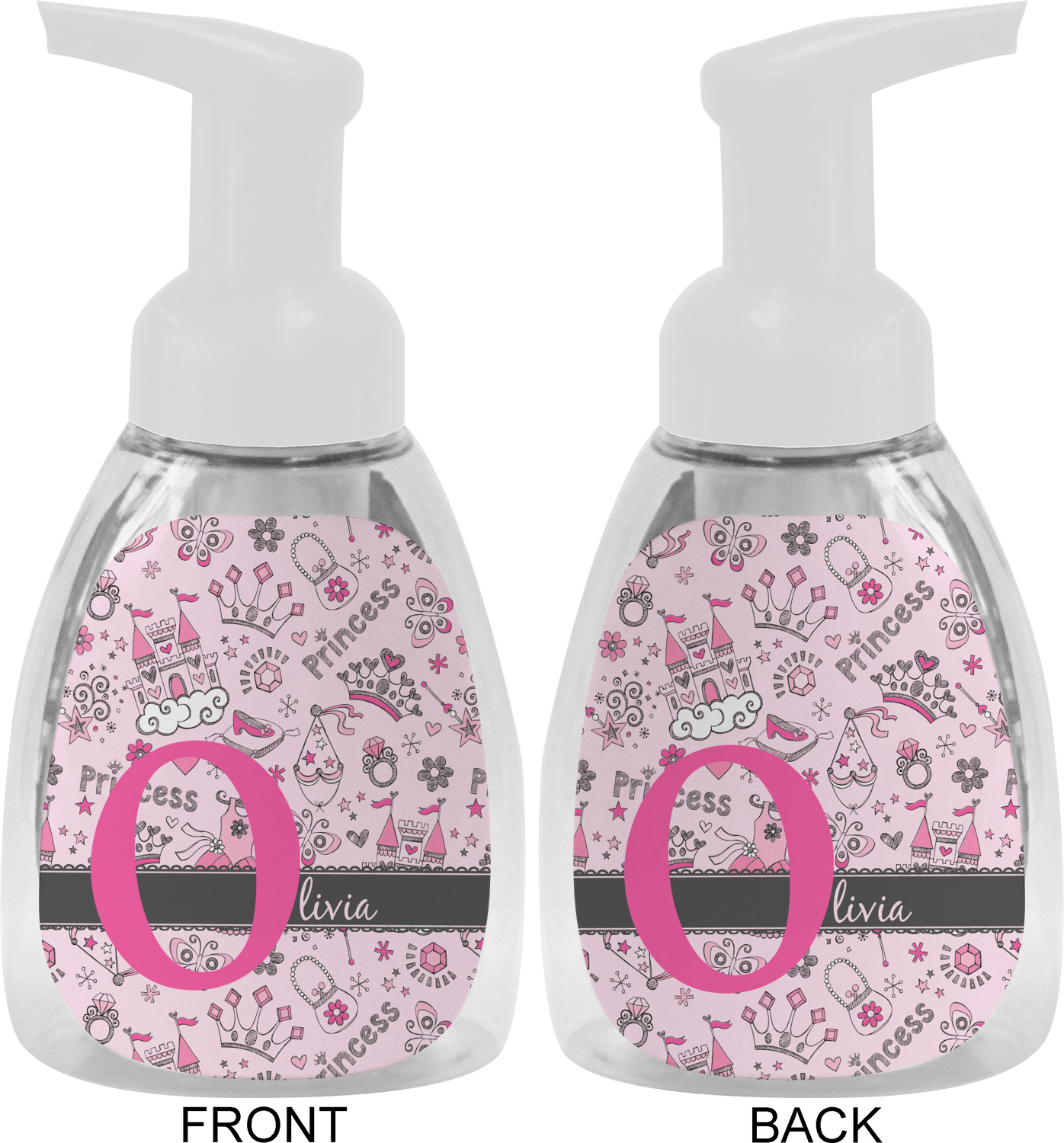 This soap dispenser is made of a robust plastic and has a clear base. The included soap pump is available in black or white color. This dispenser is 6.5 inches tall, 3 inches wide, and 2 inches deep. We display your customized designs on the front and back sides of these foaming hand soap dispensers.