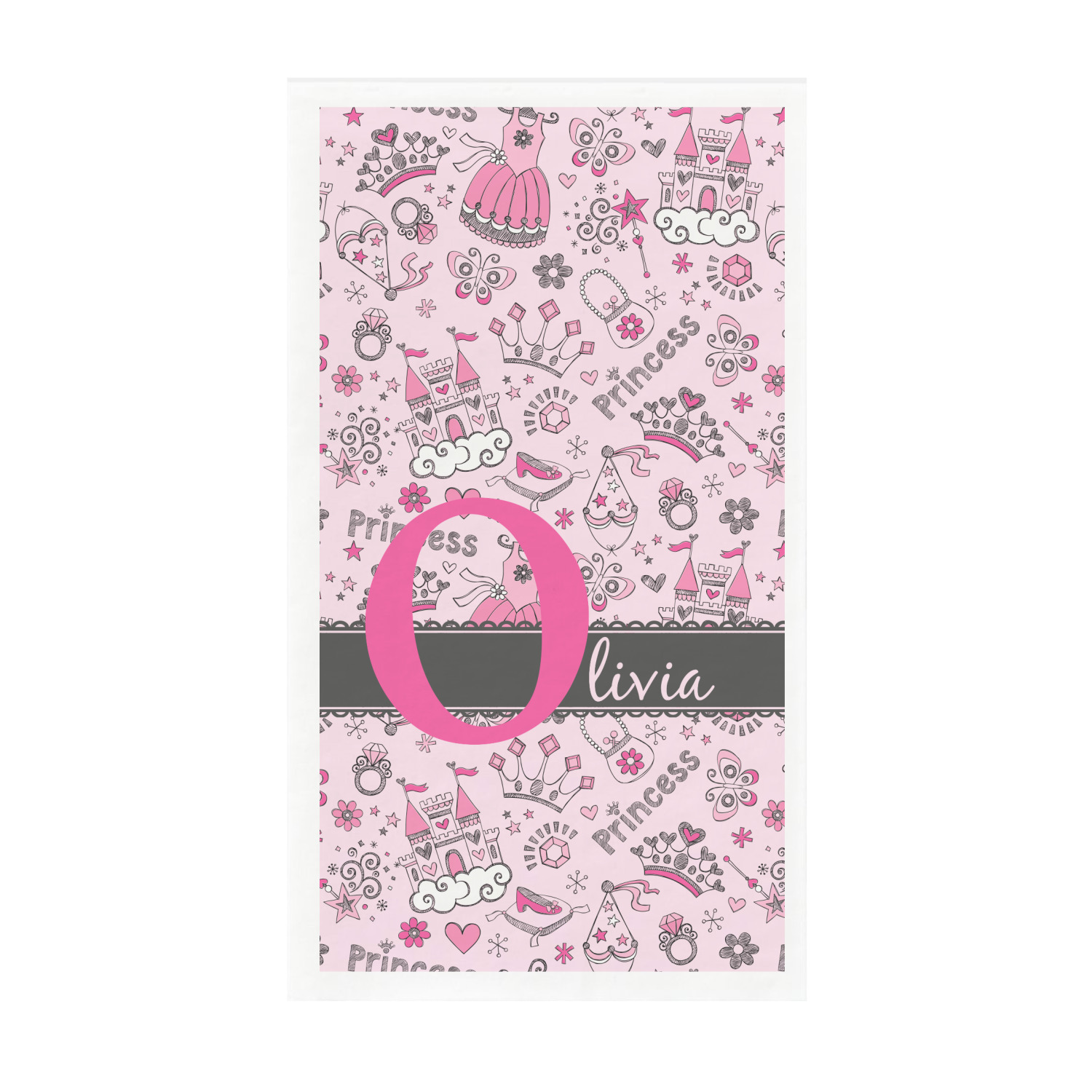 We chose to personalized the design with our Large Initial and Text on Ribbon Style. We chose the scalloped ribbon, and dark pink and dark grey for our colors. We have many princesses & women in our system - you can choose any one of those and customize to suit your personal style.