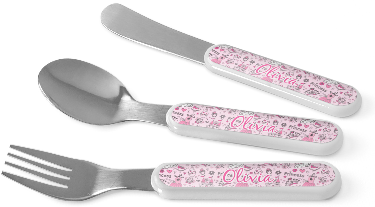 This set of kids' silverware includes a 5.5 inch spoon, fork, and knife, catered to your little one's needs. The prongs of this fork are flat and dull, while our spoon is small enough for tiny mouths, and the dullness of the knife itself resembles a butter knife, at most. These kids' utensils are made of stainless steel, while the handles are crafted from a durable plastic that will withstand the energy and use of your young one. We print your customization across the handles, making the cutlery set unique to your child only.