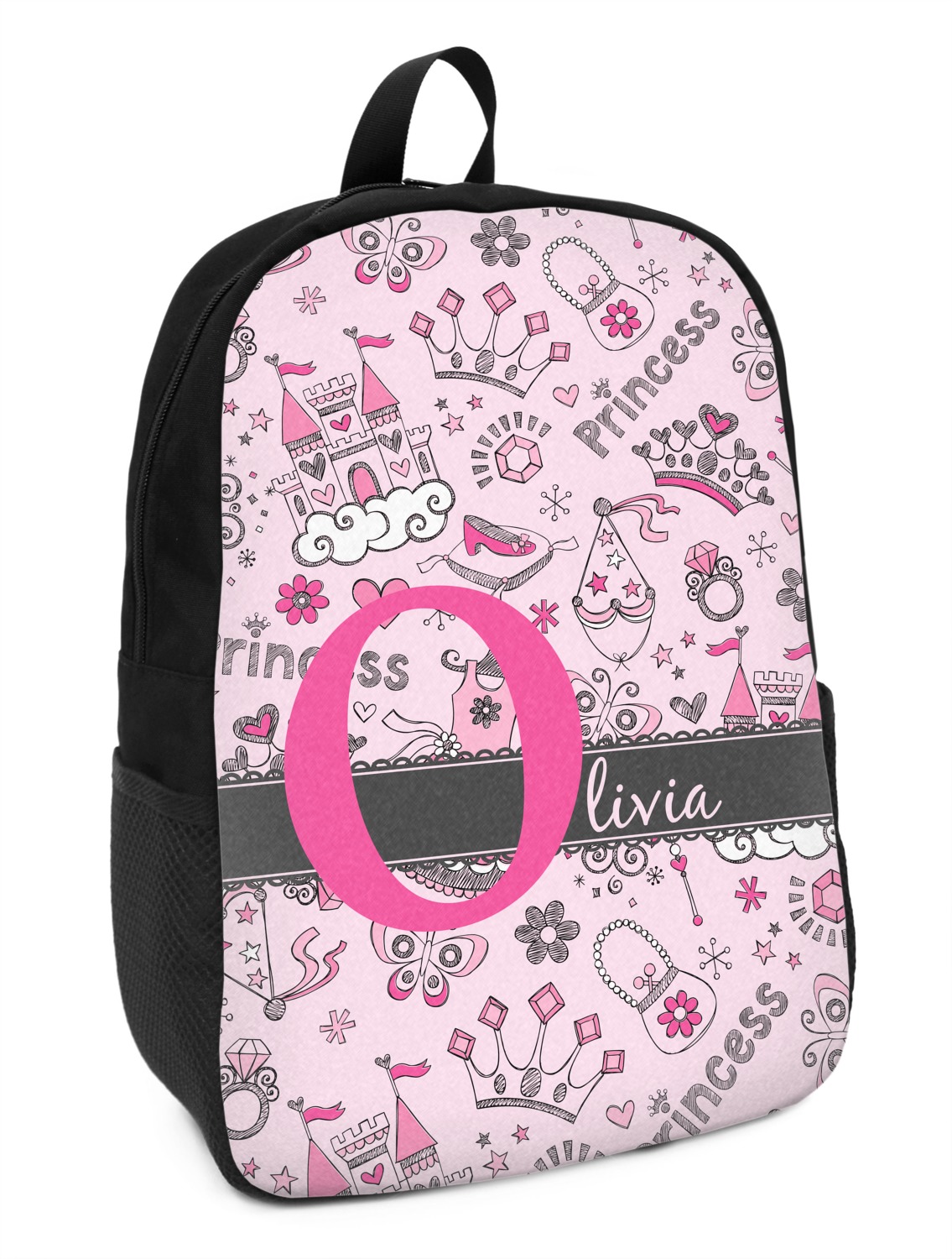 We chose to personalized the design with our Large Initial and Text on Ribbon Style. We chose the scalloped ribbon, and dark pink and dark grey for our colors. We have many princesses & women in our system - you can choose any one of those and customize to suit your personal style.