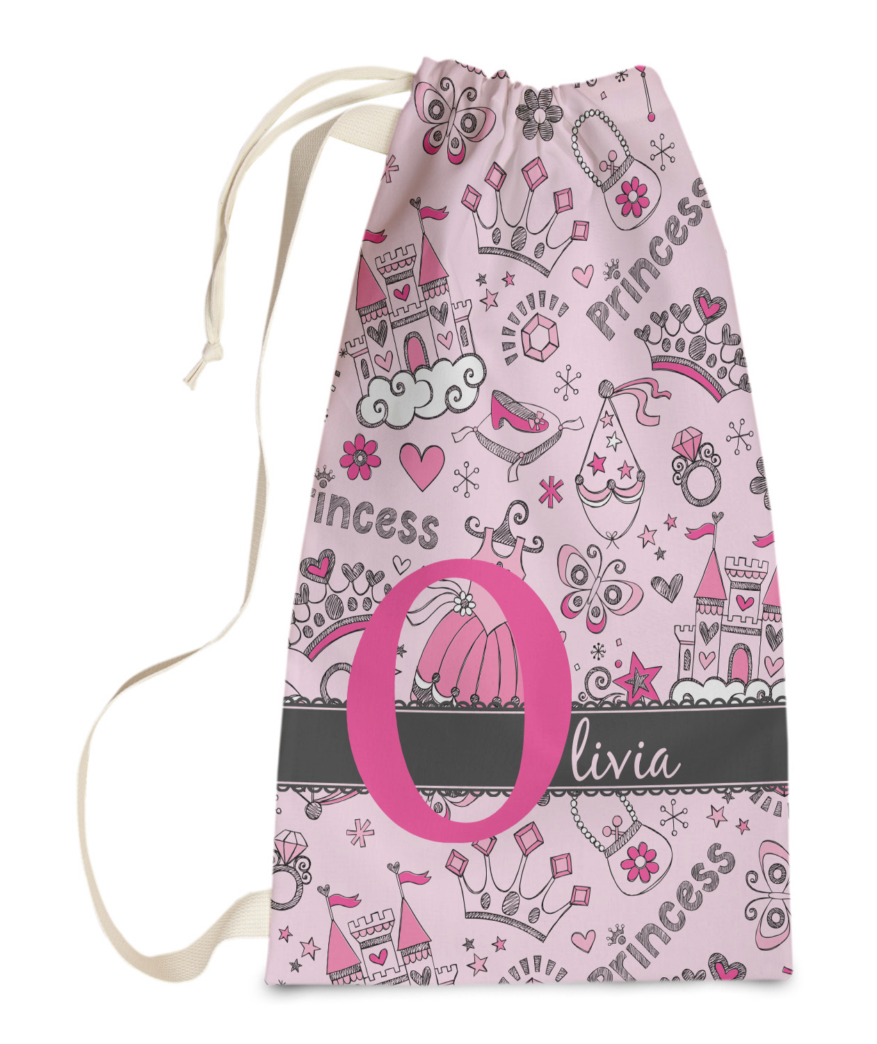 Carry your laundry in style with these customized laundry bags. Available in two sizes, featuring a natural colored woven strap and a cinch cord, these bags hold a lot of clothes or anything else you want to fit in them.